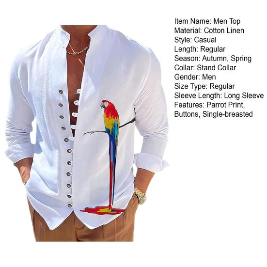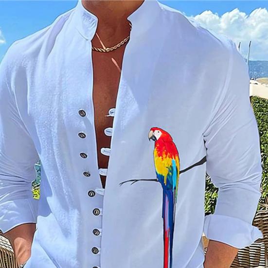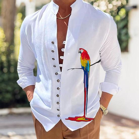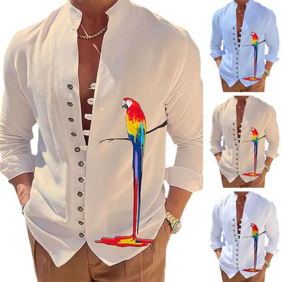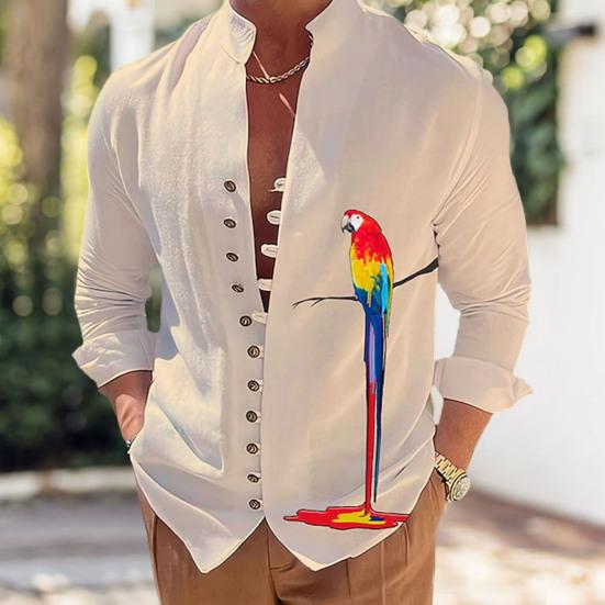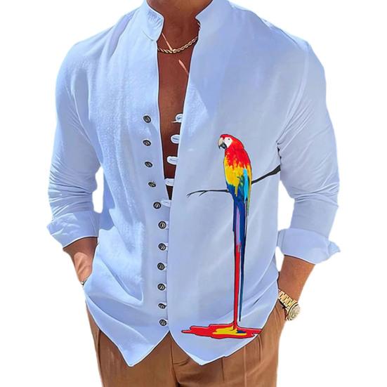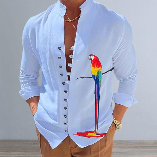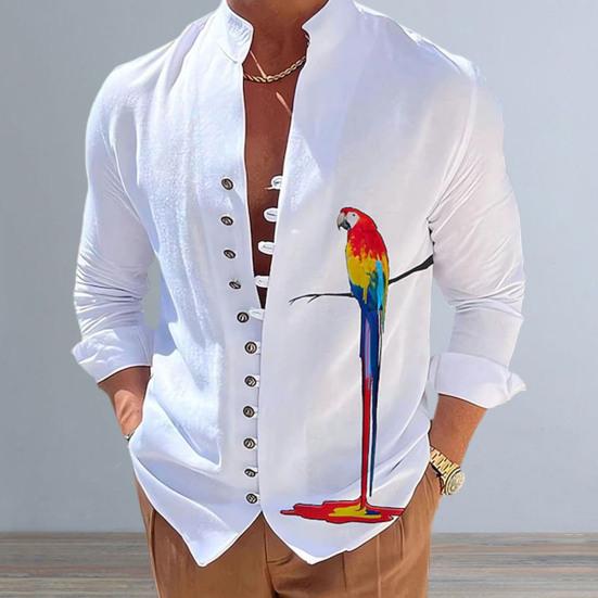 Мужская рубашка с принтом попугая и воротником-стойкой с длинным рукавом, однобортная, средней длины, повседневная одежда, повседневная мягкая дышащая мужская осенняя верхняя мужская одежда