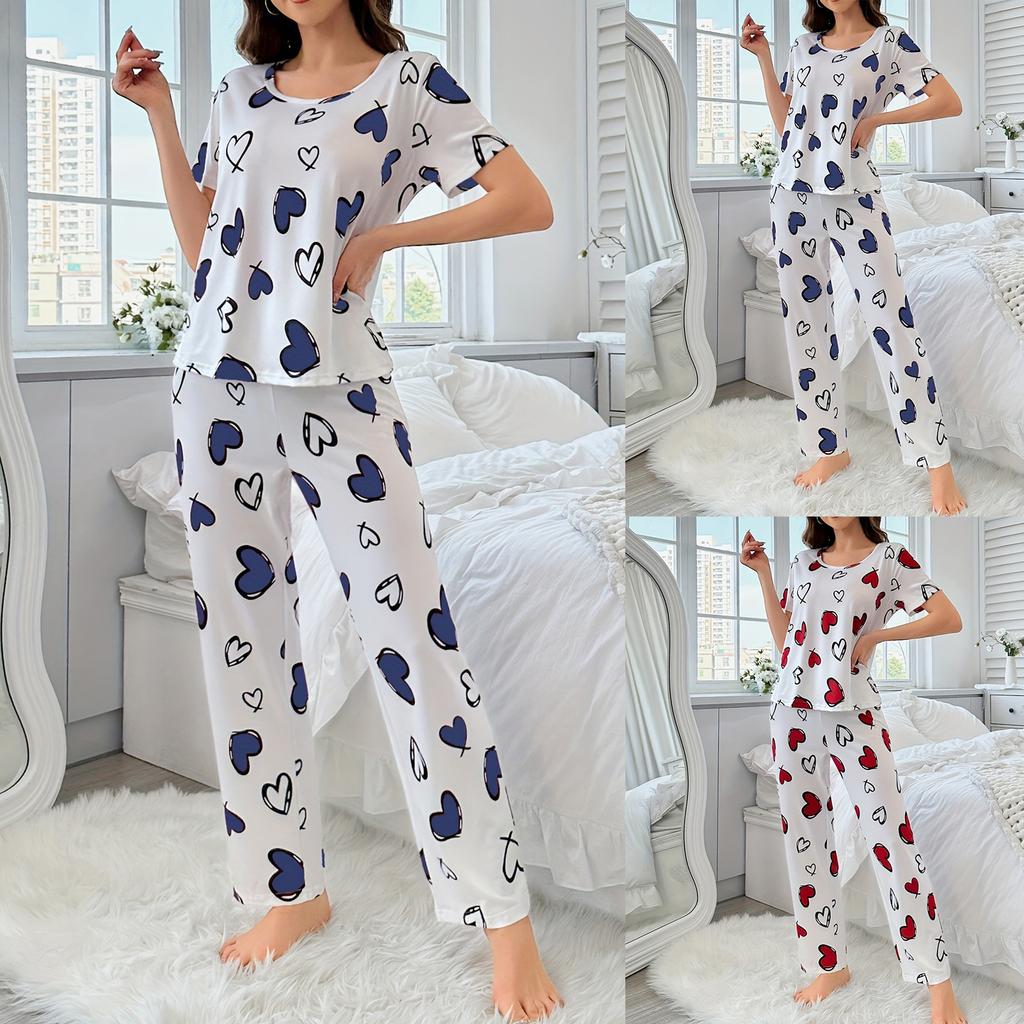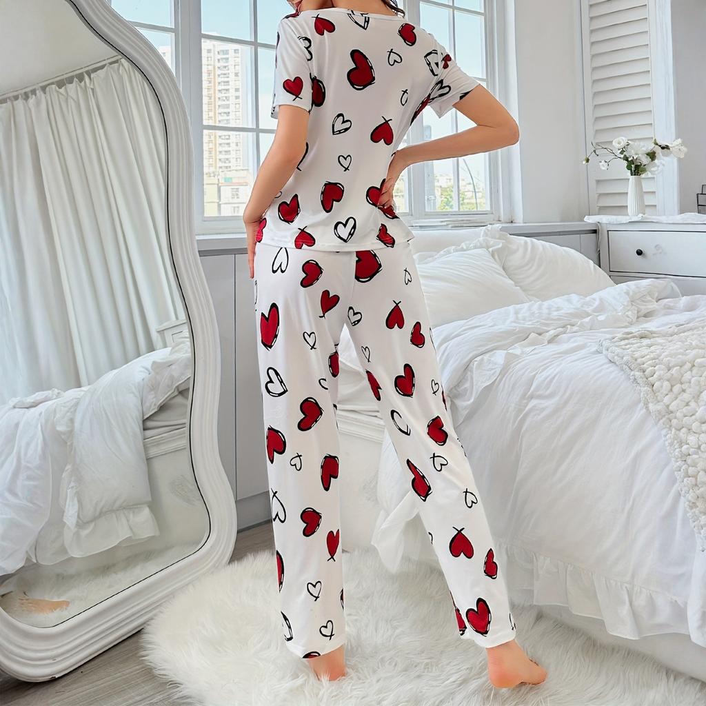 Женская одежда для сна, брюки с коротким рукавом, удобный повседневный домашний костюм с принтом сердечек, одежда для сна, подходящая для женщин для ношения на улице