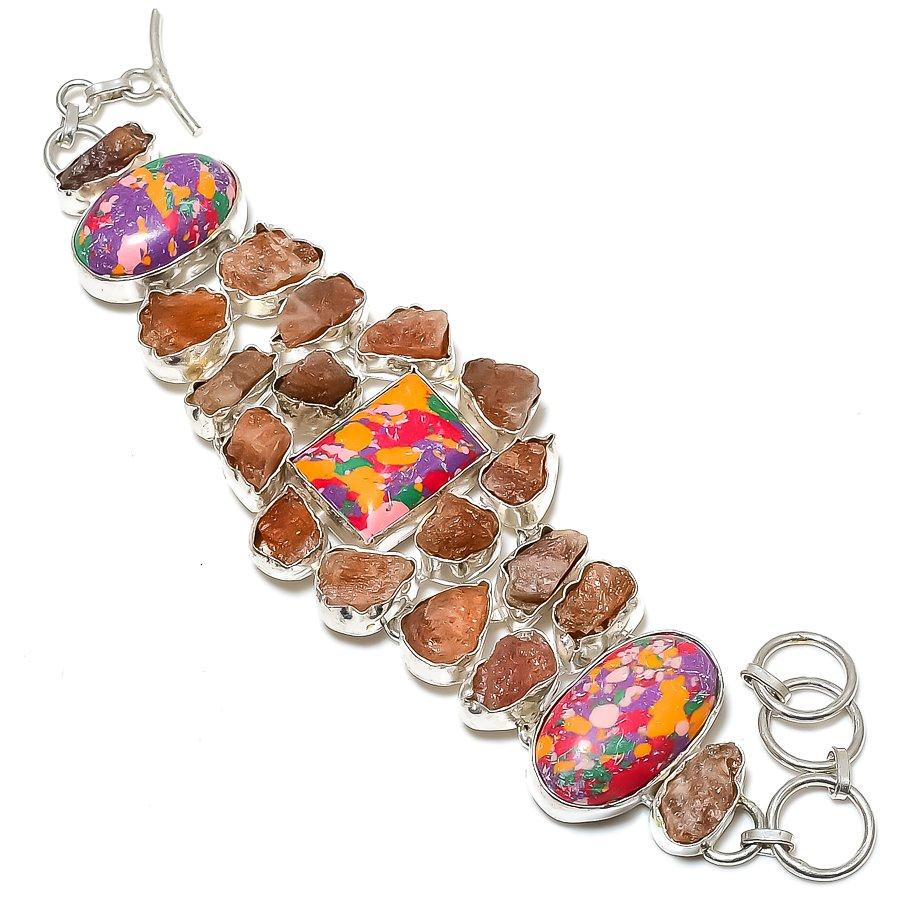 Мозаичная яшма, Солнечный камень Необработанный драгоценный камень Браслет из серебра 925 пробы 7-8"