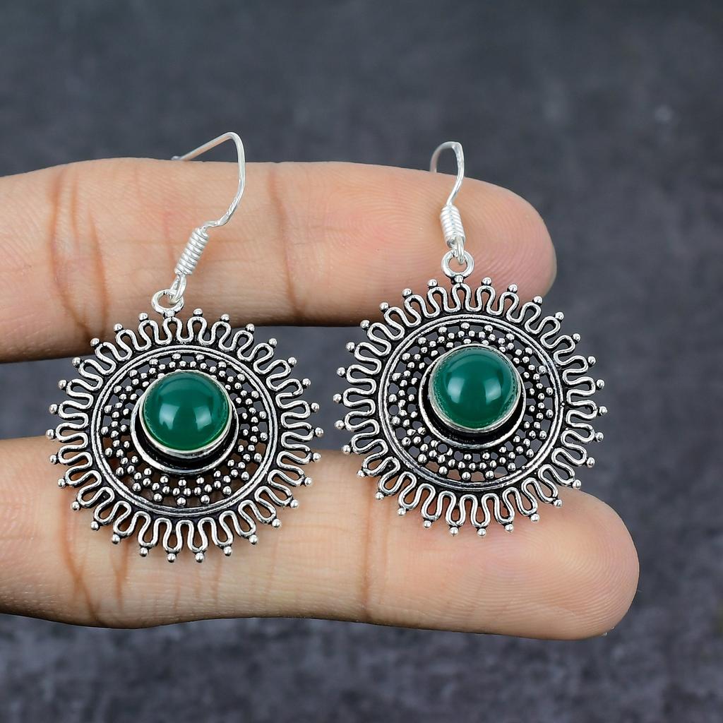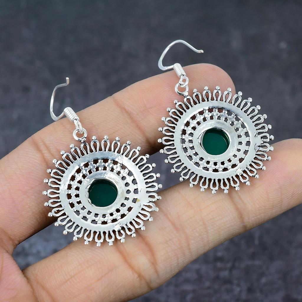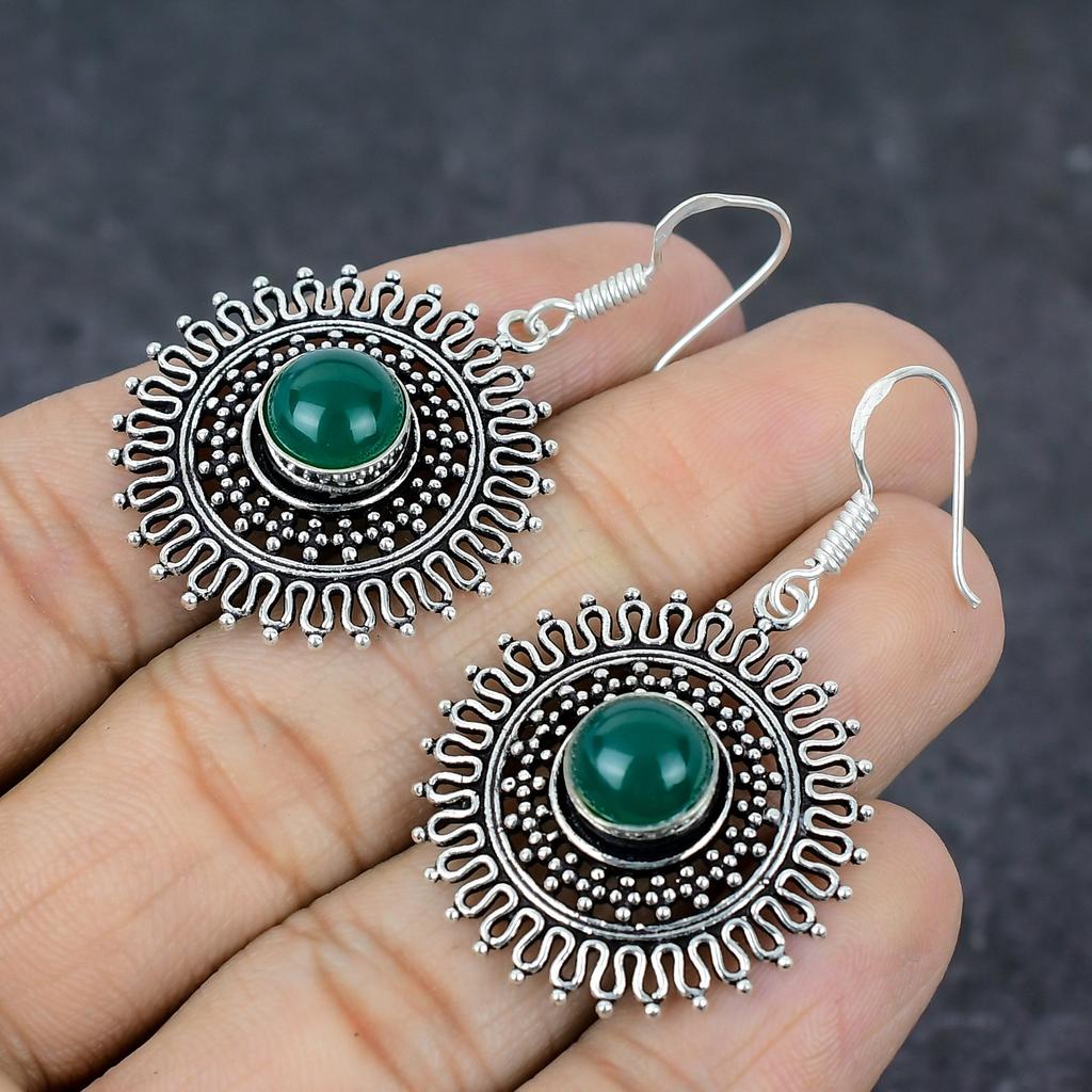 Зеленый Оникс Драгоценный Камень 925 Стерлинговое Серебро Подарок Ювелирное Изделие Серьга 2"