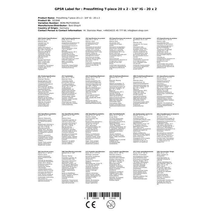 Raccord T Pressfitting 20mm, Filetage Intérieur 3/4