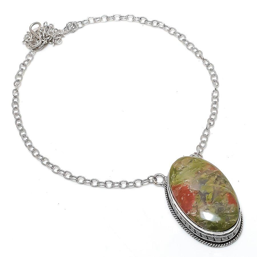 Унакит Драгоценный камень 925 Стерлинговое серебро Ювелирное ожерелье 18"
