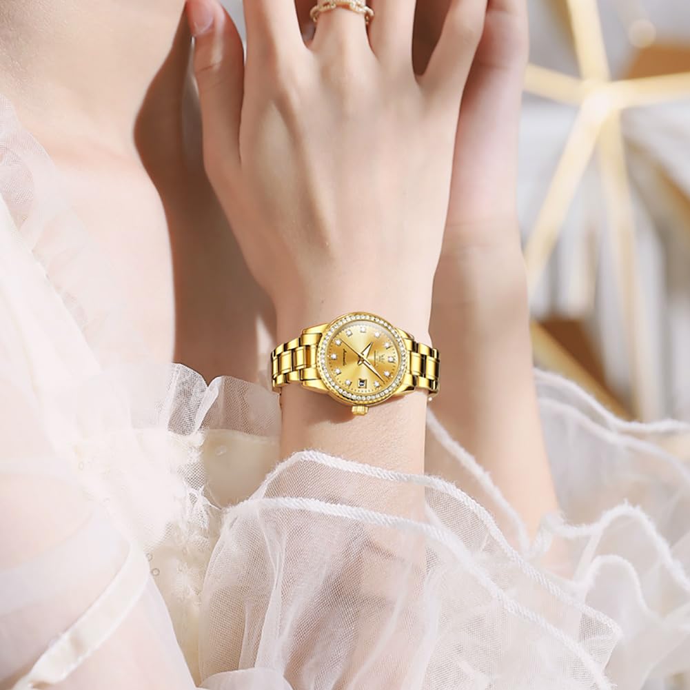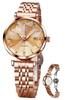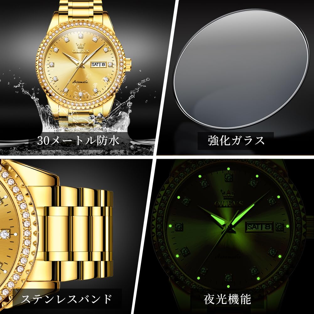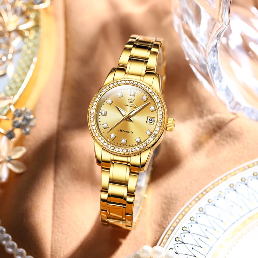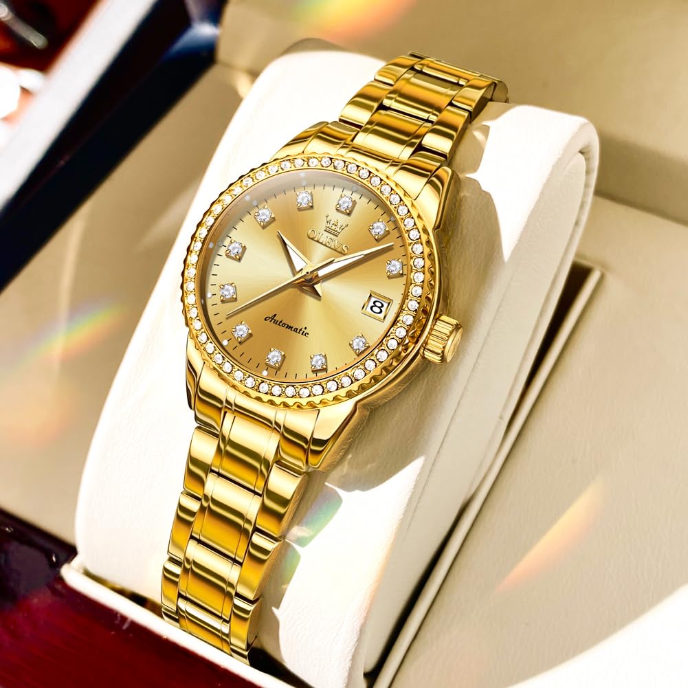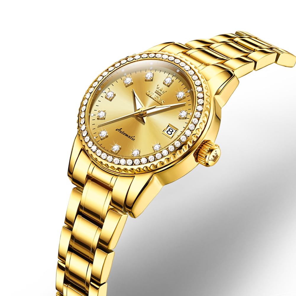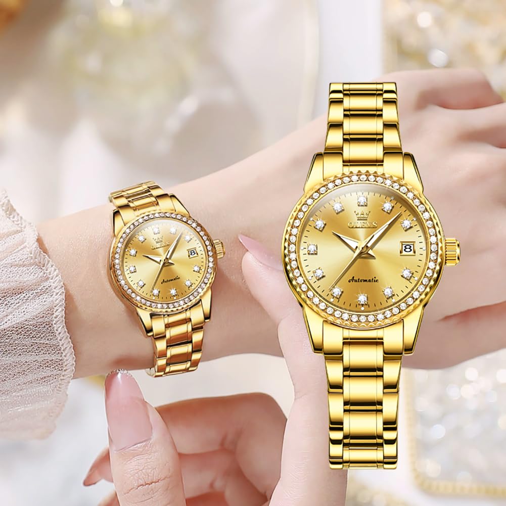 Женские автоматические механические часы OLEVS, Милые, Водонепроницаемые, Люминесцентные, С бриллиантами, Блестящие, Отображение даты, Золотые