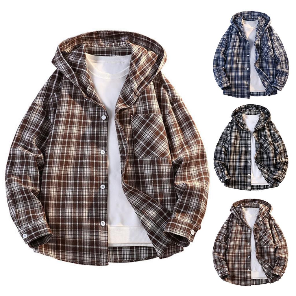 Мужская и женская свободная, повседневная и модная клетчатая рубашка с капюшоном с принтом, мужская рубашка с длинным рукавом на пуговицах, куртка