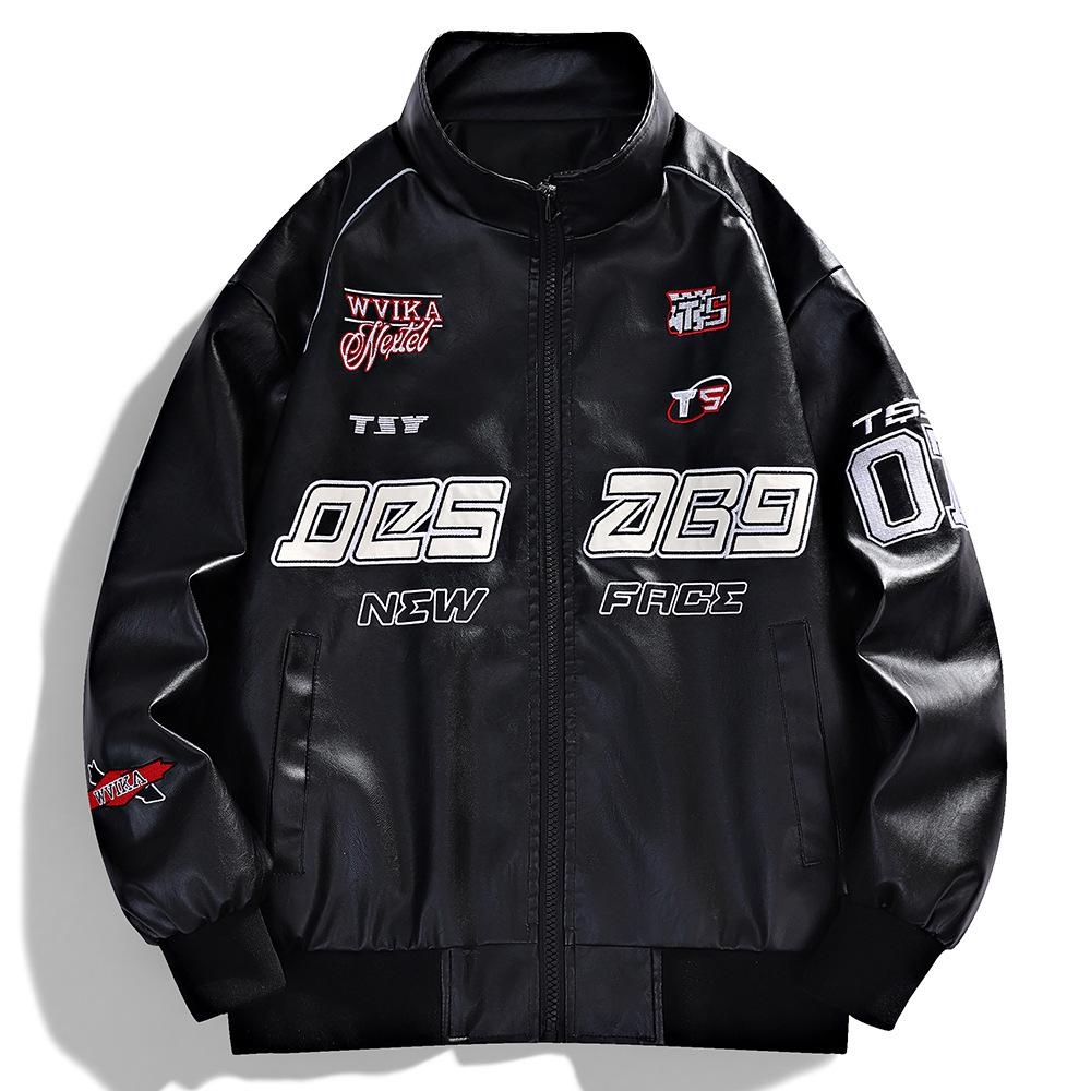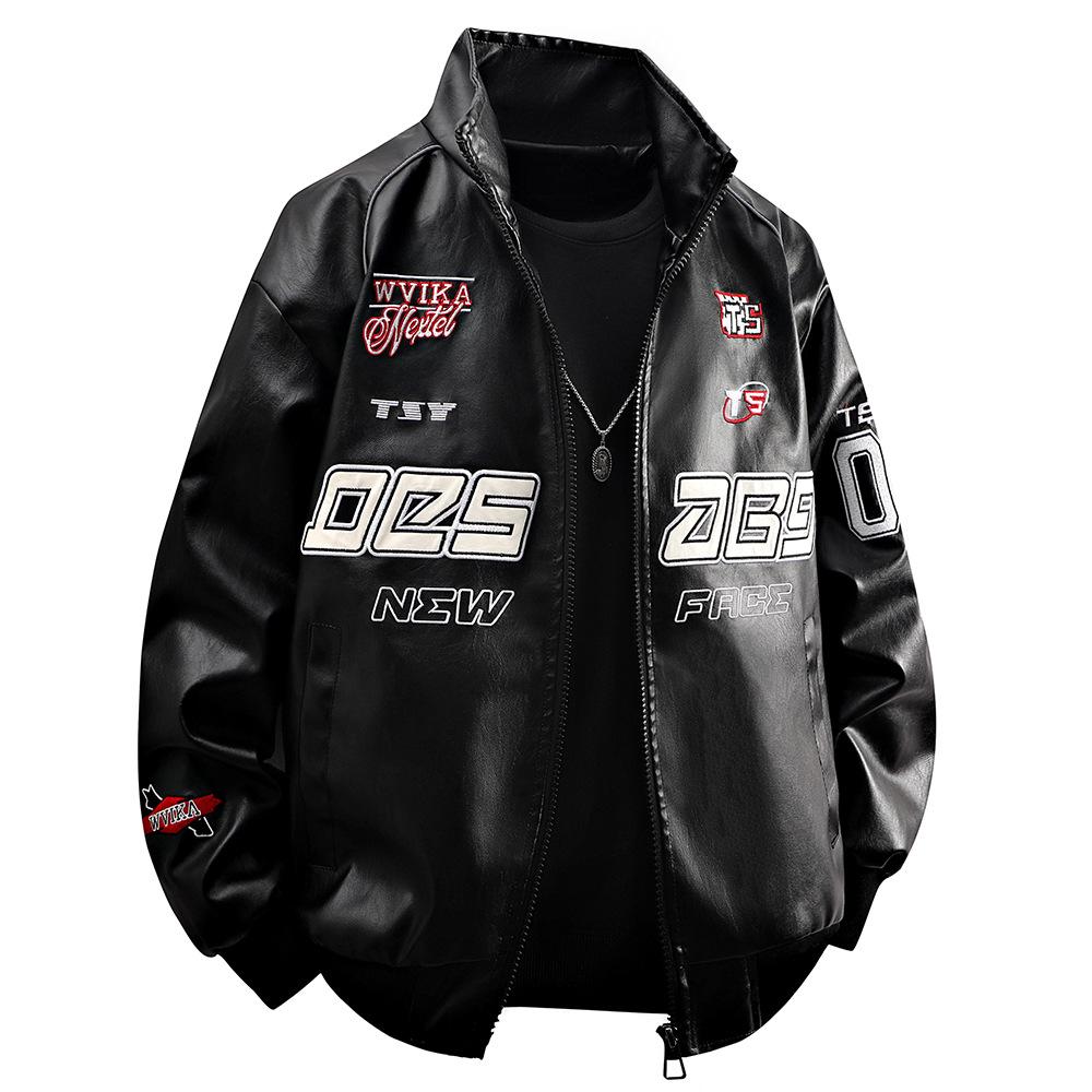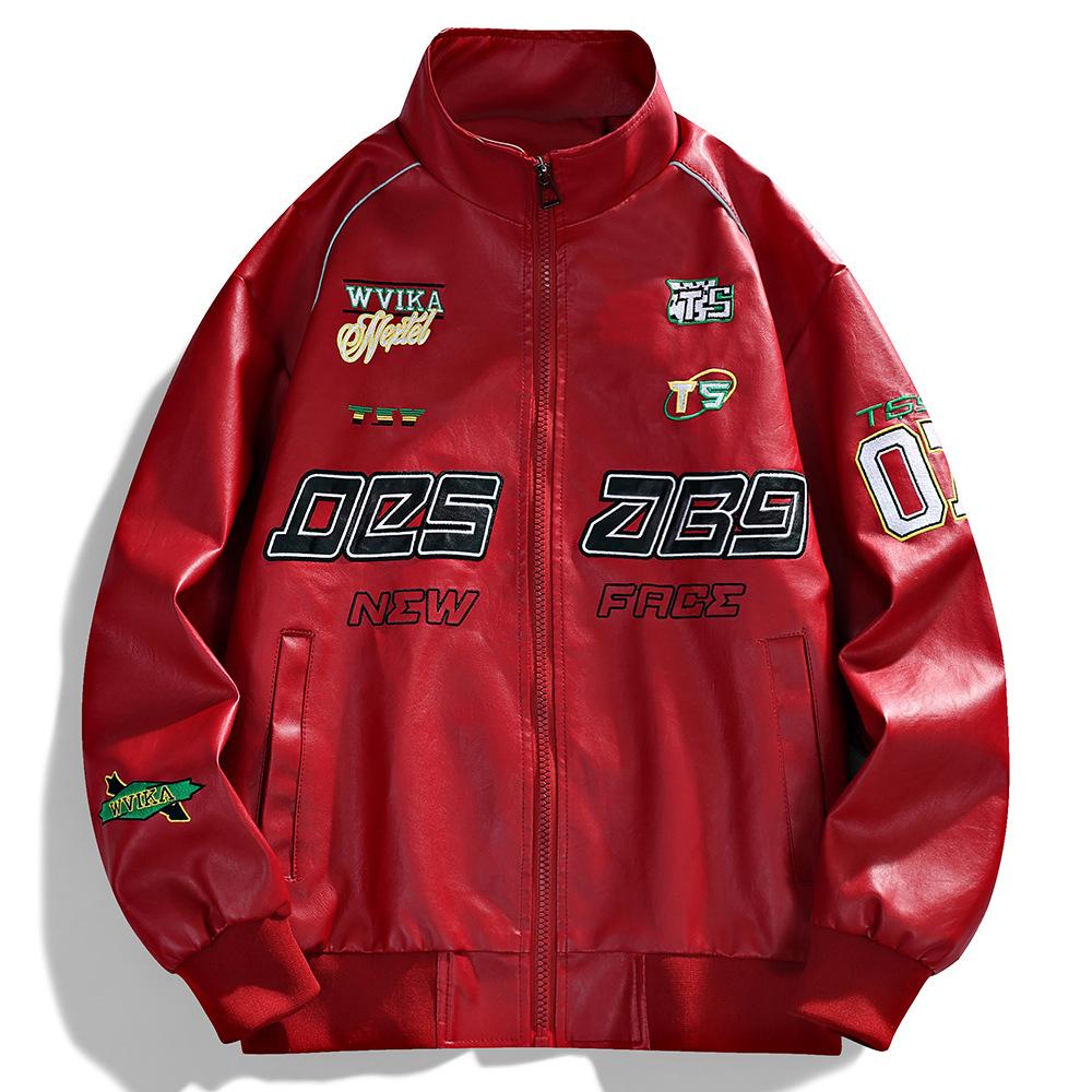 Американский гоночный костюм Вышитая кожаная куртка Мужская уличная Красивая Стойка Воротник Мотоциклетная кожаная куртка Куртка