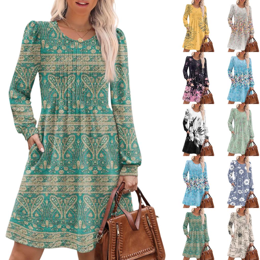 Женское повседневное платье с длинным рукавом, плиссировкой, круглым вырезом, цветочным принтом и карманами — купить товар онлайн с бесплатной доставкой до всему миру!