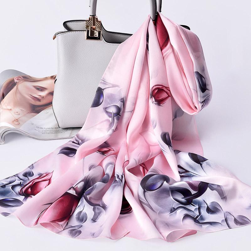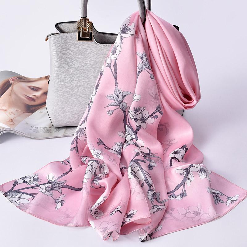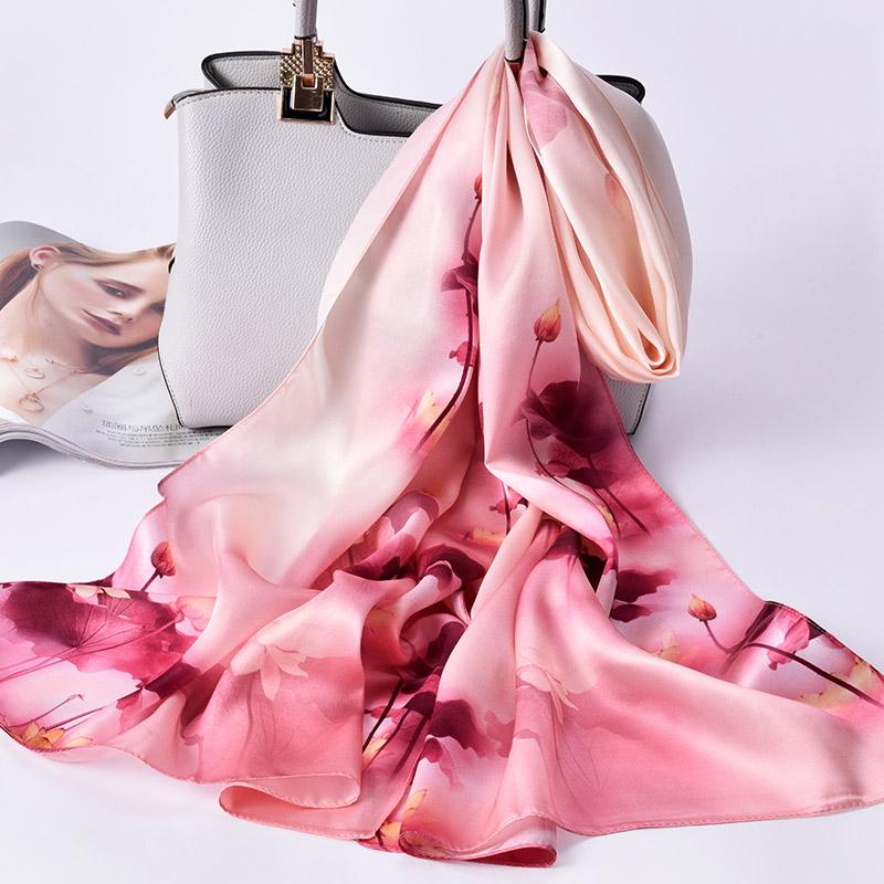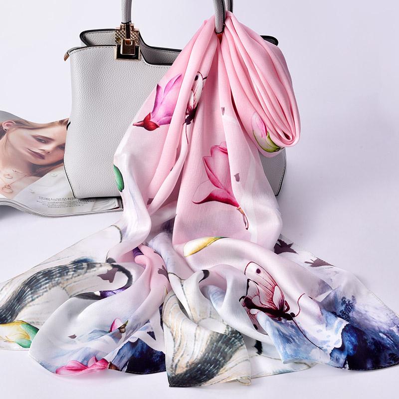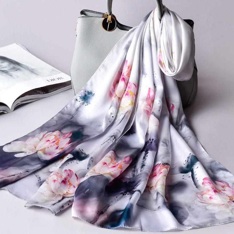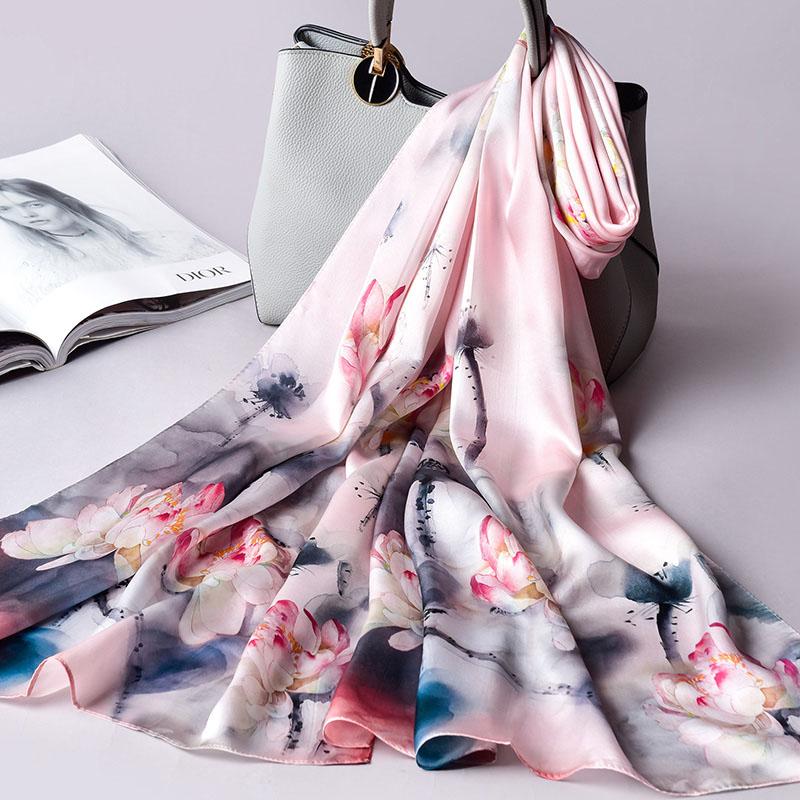 Женский длинный шарф из 100% натурального шелка, роскошный, с цветочным принтом, китайский шелковый платок-повязка на голову, шали и накидки из натурального шелка, фуляр для женщин