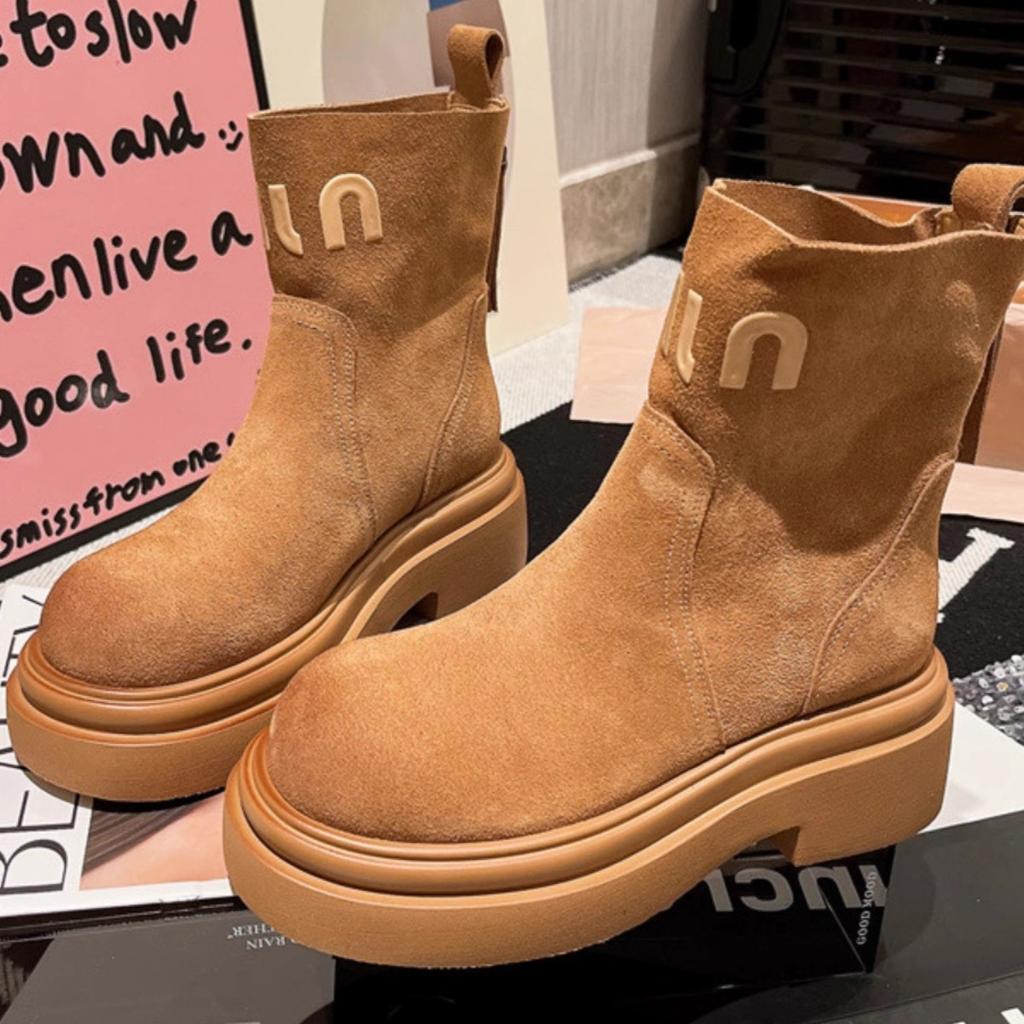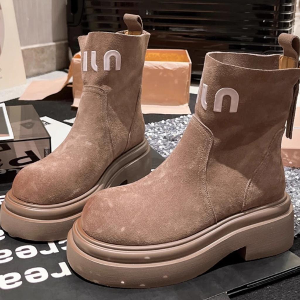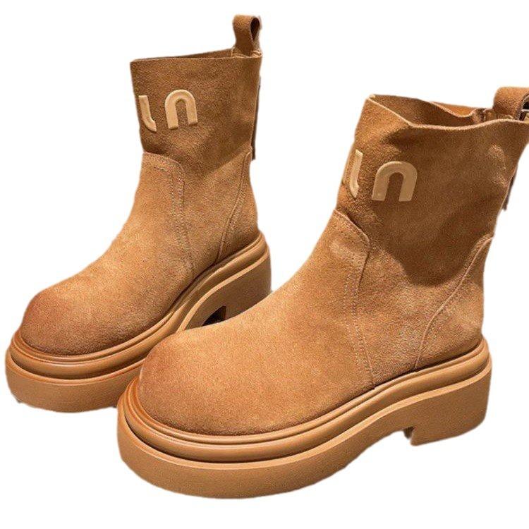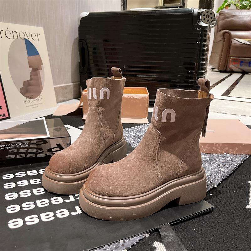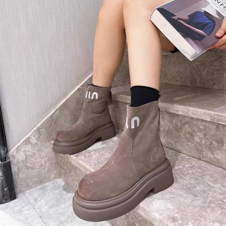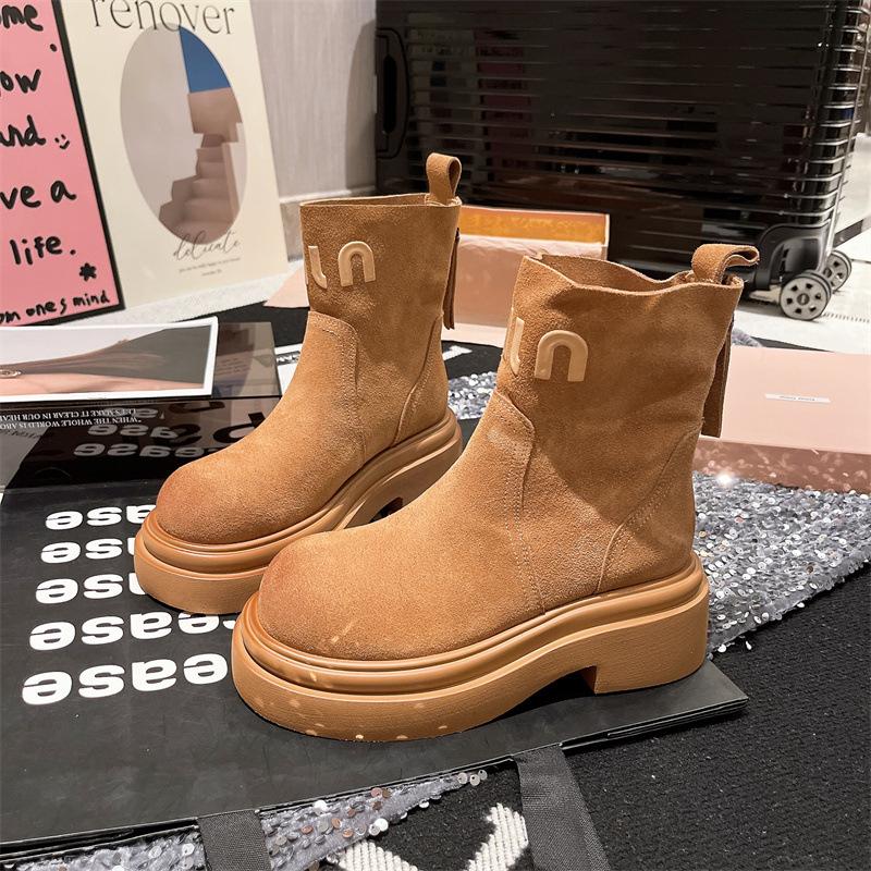 Платформа Ботинки Мартин Женская обувь Мех Письмо Сигаретные ботинки Ботинки Челси Маффин Локомотив Короткие ботинки Инструментальные Ревень Ботинки