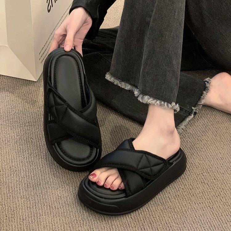 Шлепанцы с дерьмом женские летние 2025 новые маффины толстая подошва нескользящие крест на липучке пляжные шлепанцы на одной подошве