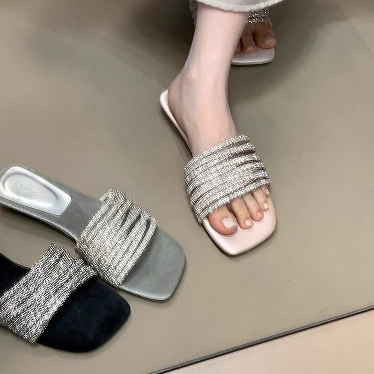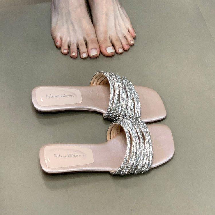 Модные однословные тапочки женские 2025 лето новые для улицы ленивые стразы на низком каблуке сандалии с открытым носком высокое чувство