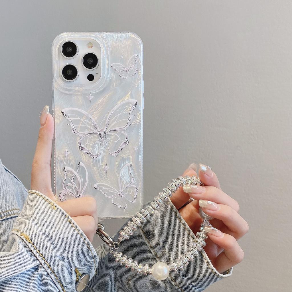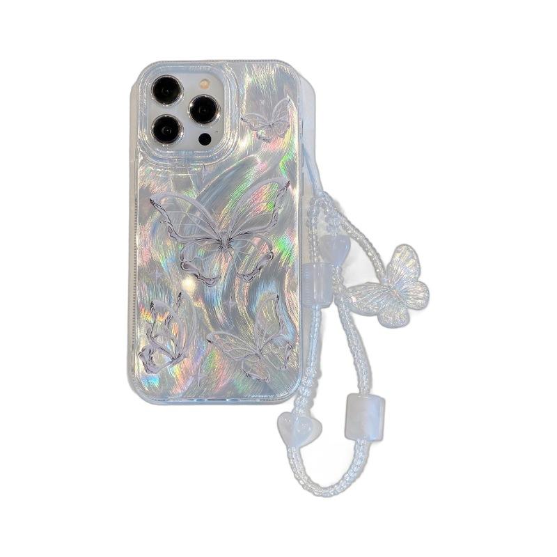 Подходит для iPhone 15 Высококлассный чехол-перо Apple 16 Цепочка из жемчуга-бабочки Apple 11 Серебристый жесткий защитный чехол