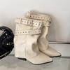 Белые ботильоны на толстом высоком каблуке с острым носком в британском стиле женские 2025 новая осень с юбкой увеличивающие рост и стройнящие сапоги-трубы