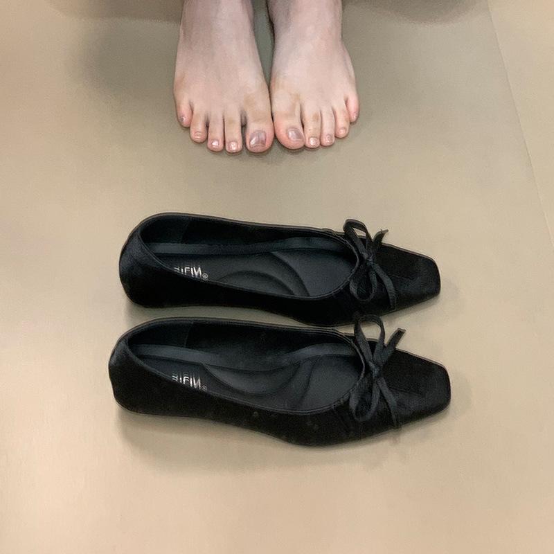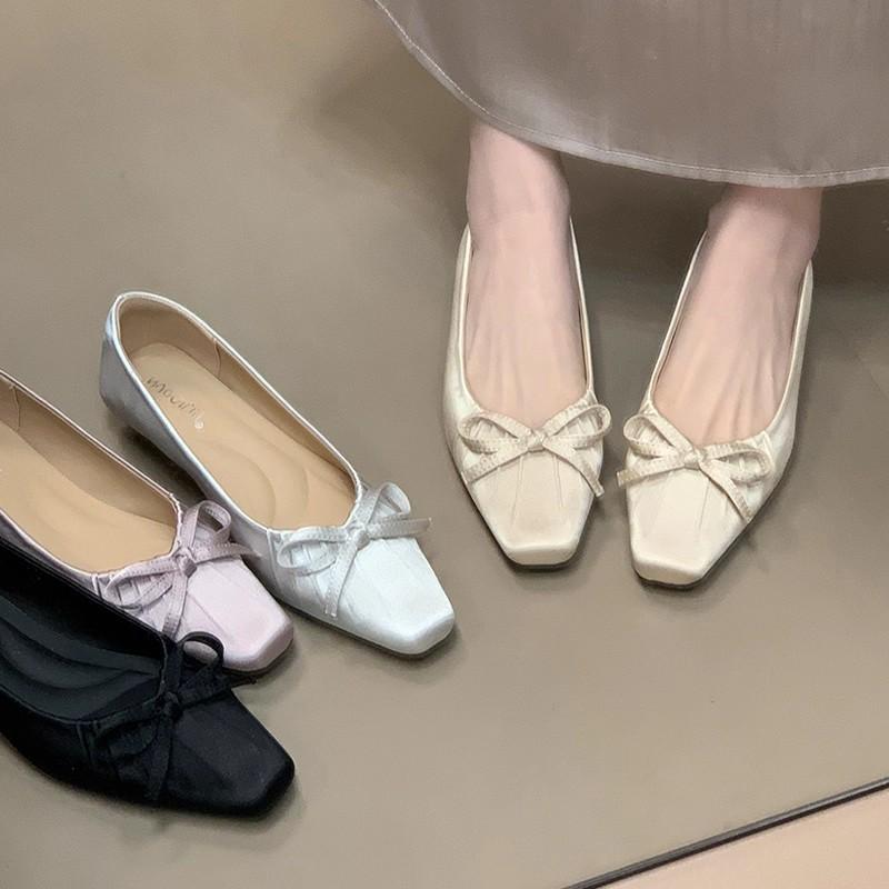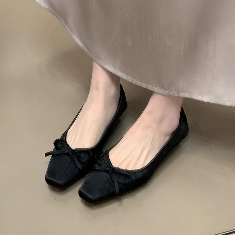 Французские атласные туфли Мэри Джейн с квадратным носком и бантом, женские, 2025, осень, новые, атласные, плиссированные, на плоской подошве, с открытым верхом, одинарные туфли