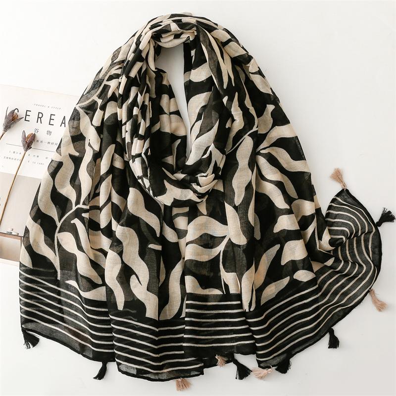 Роскошный женский шарф с лиственным узором, летняя пляжная шаль, на ощупь как хлопок и лен, с кисточками, пашмина, мусульманский хиджаб, обертывание, женский вискозный шарф