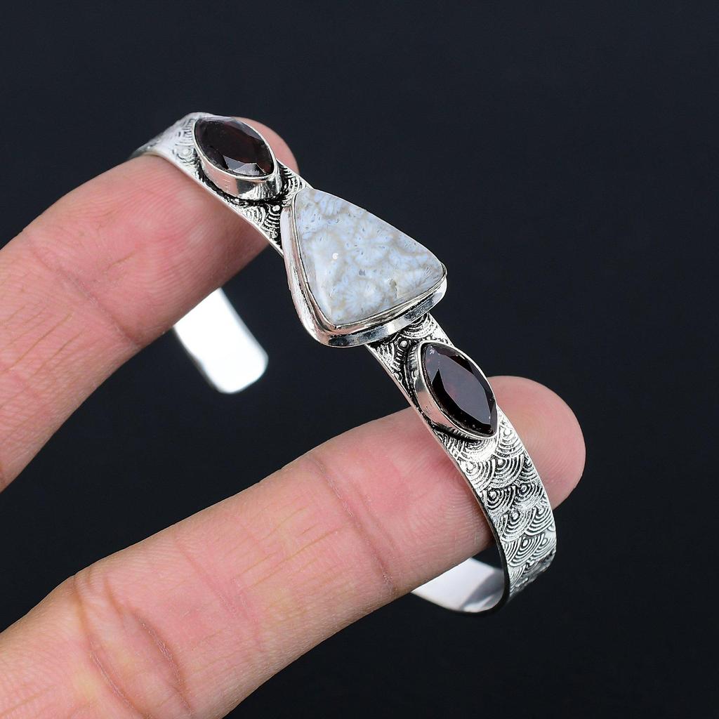 День дочери Сделка Натуральный ископаемый коралл гранат браслет-манжета стерлинговое серебро