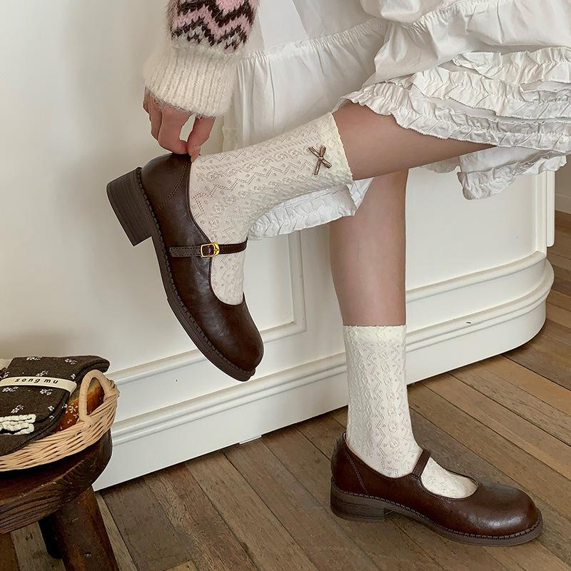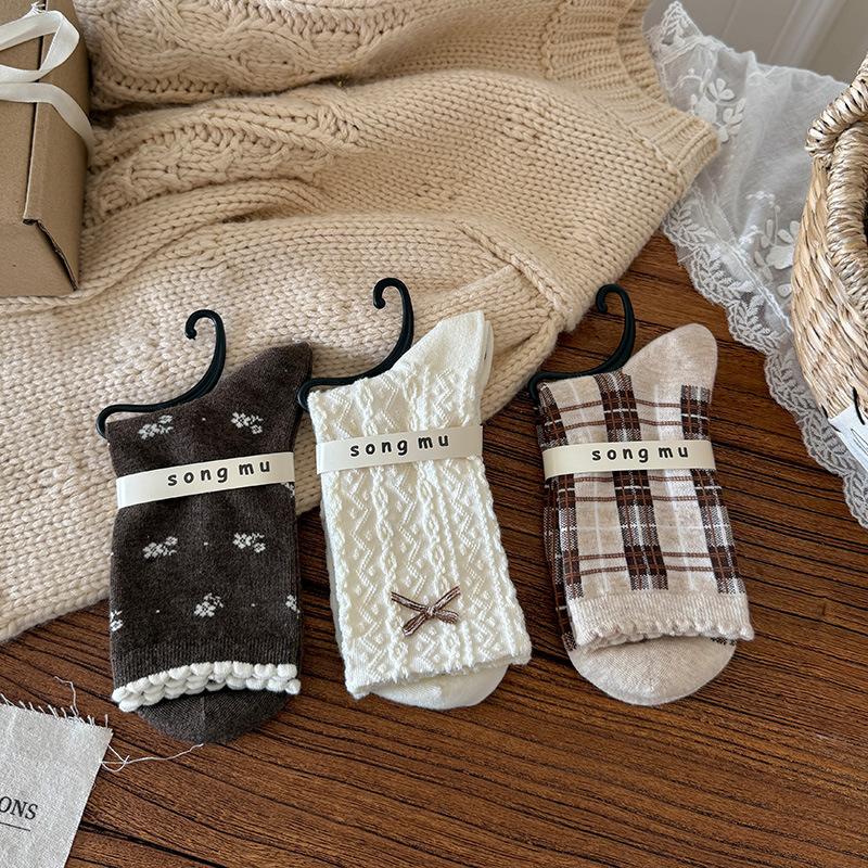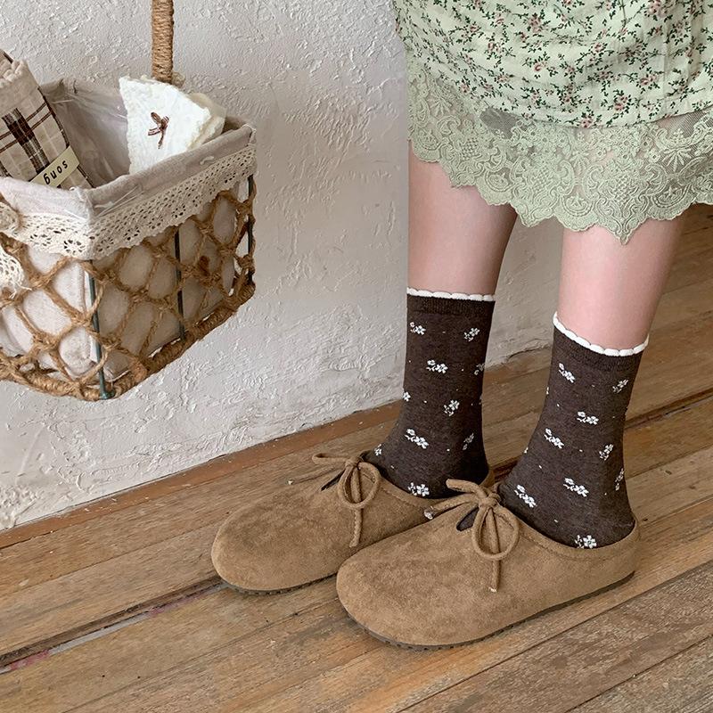 Женские весенне-осенние винтажные милые короткие носки с цветочным льняным узором, бантом и кружевом, без косточек, трубчатые, с ворсом