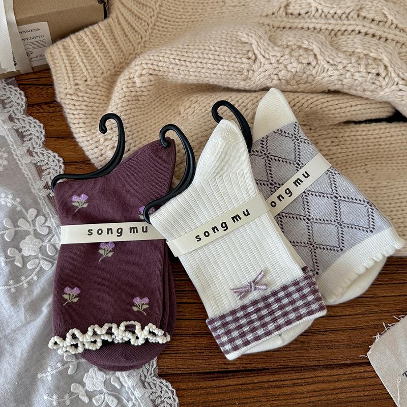 Женские весенне-осенние милые носки-гольфы с оборками и бантом, ягодно-пурпурные в клетку, бесшовные