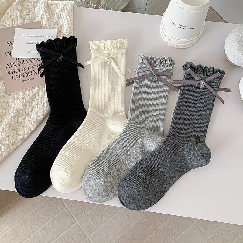 Женские весенне-осенние милые носки с лентами-бантами, пуговицами и кружевом в балетном стиле