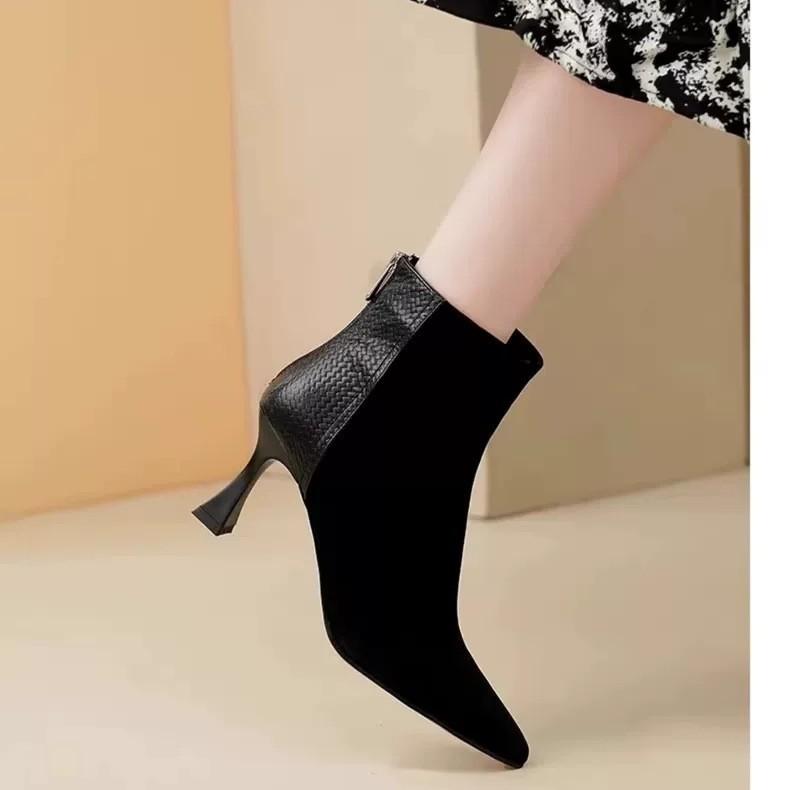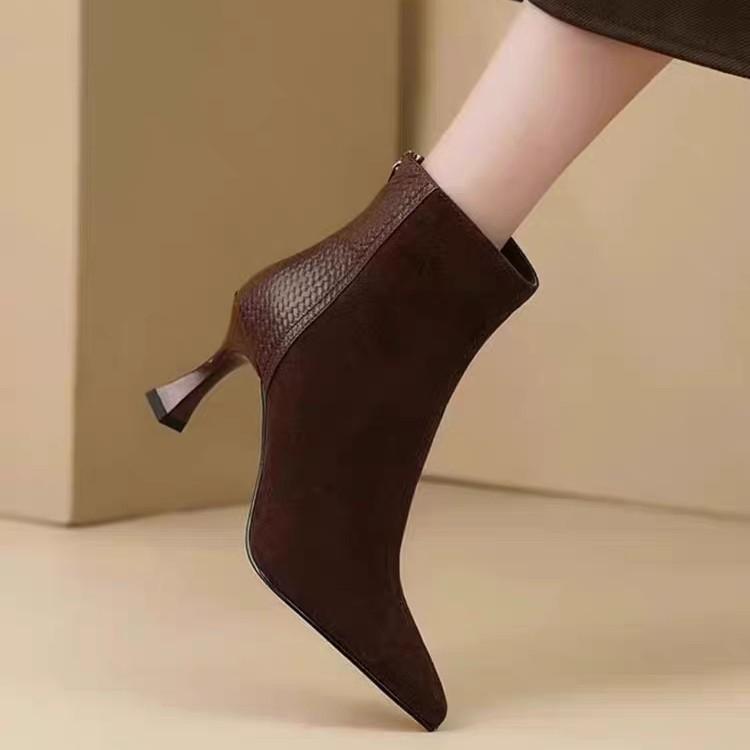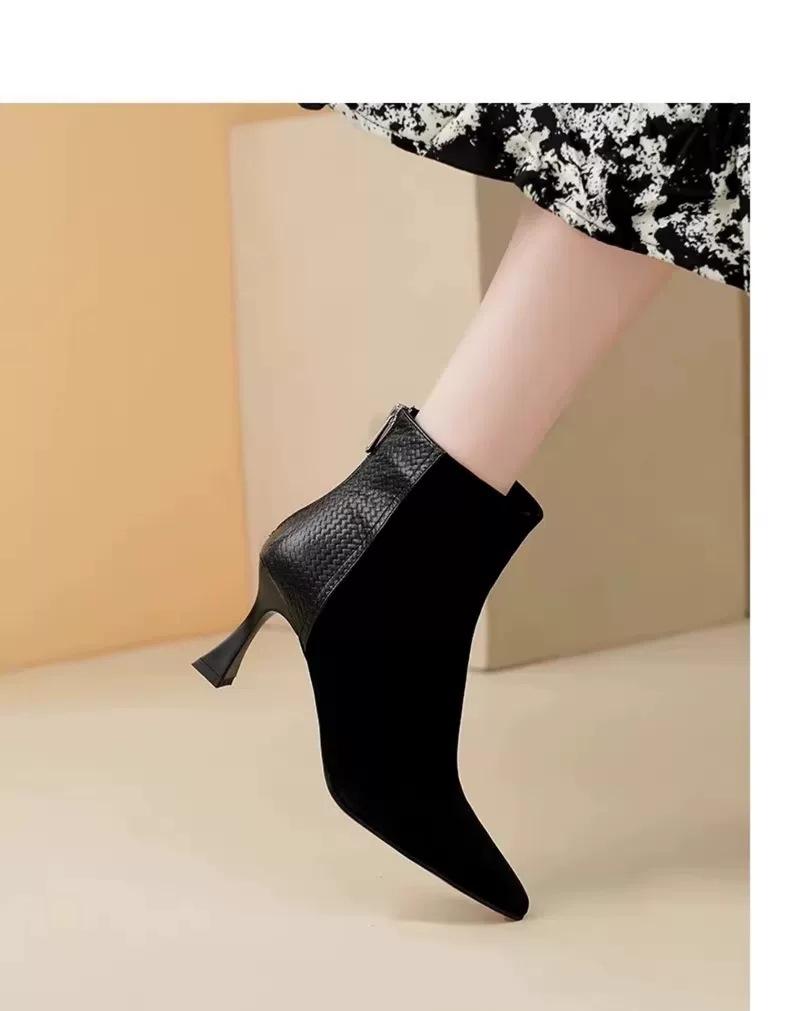 Французский маленький ароматный стиль осень и зима короткие ботильоны высокий каблук ботинки челси тонкие ботинки тонкий каблук острый носок телесный бархат и голые ботинки