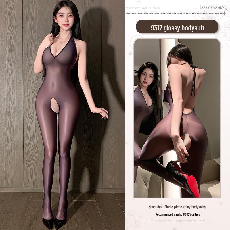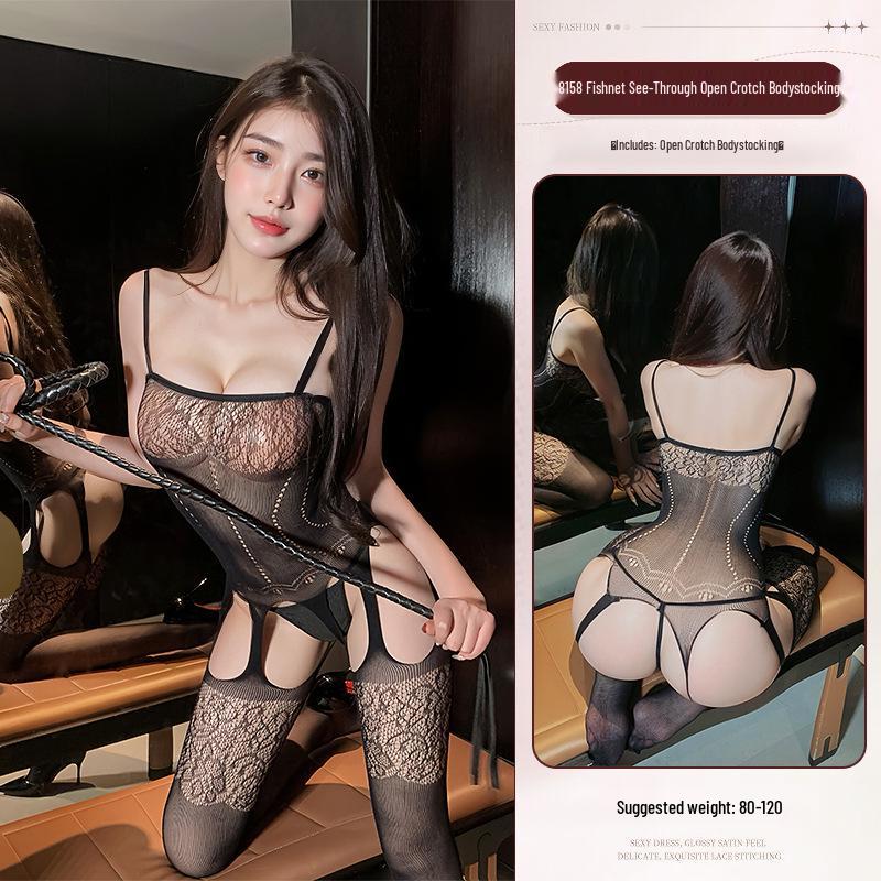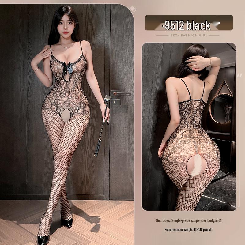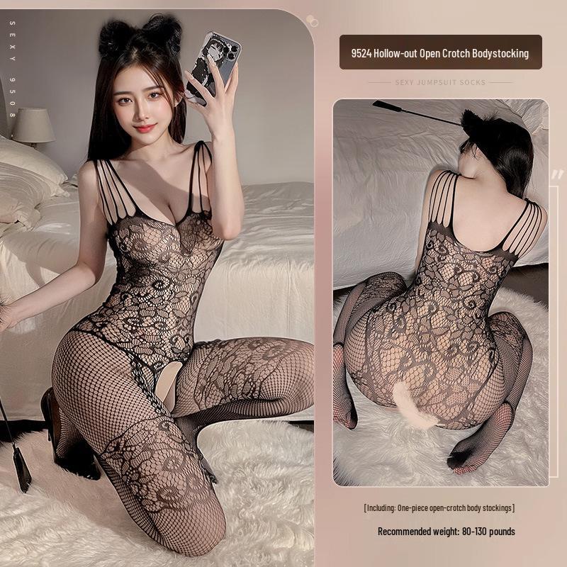 Соблазнительное боди Цзи Юйцин: Сексуальное белье с чулками, с открытой промежностью, с вырезами - несъемный бодисток.