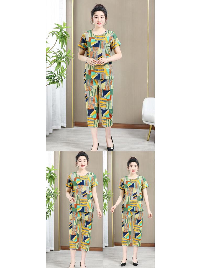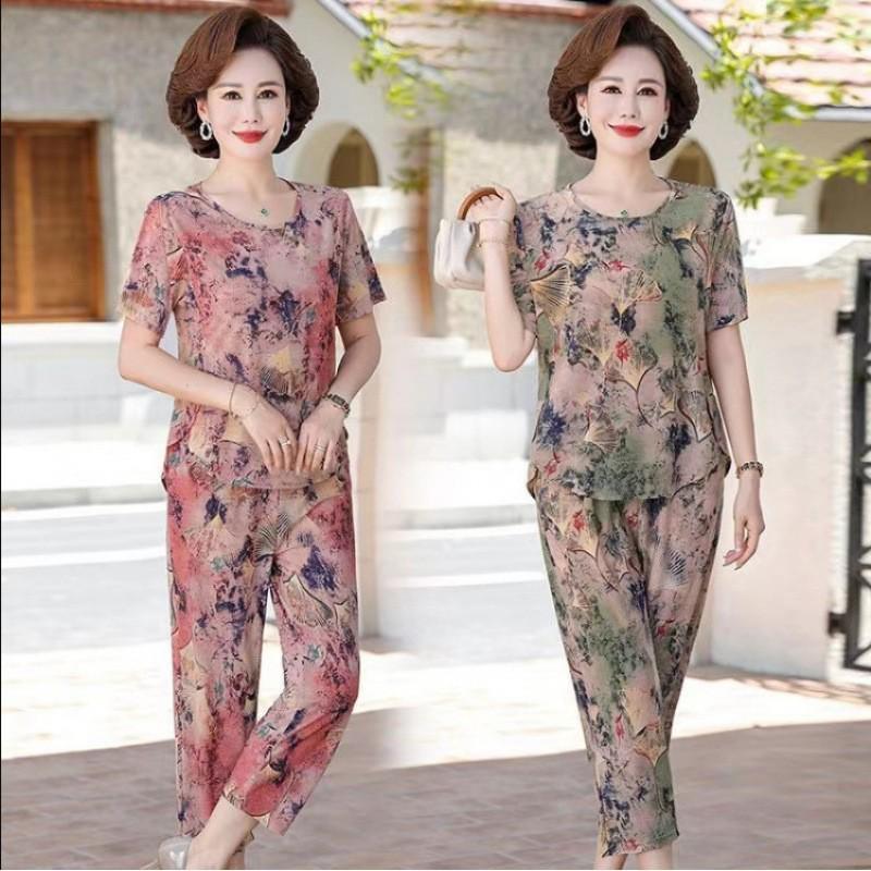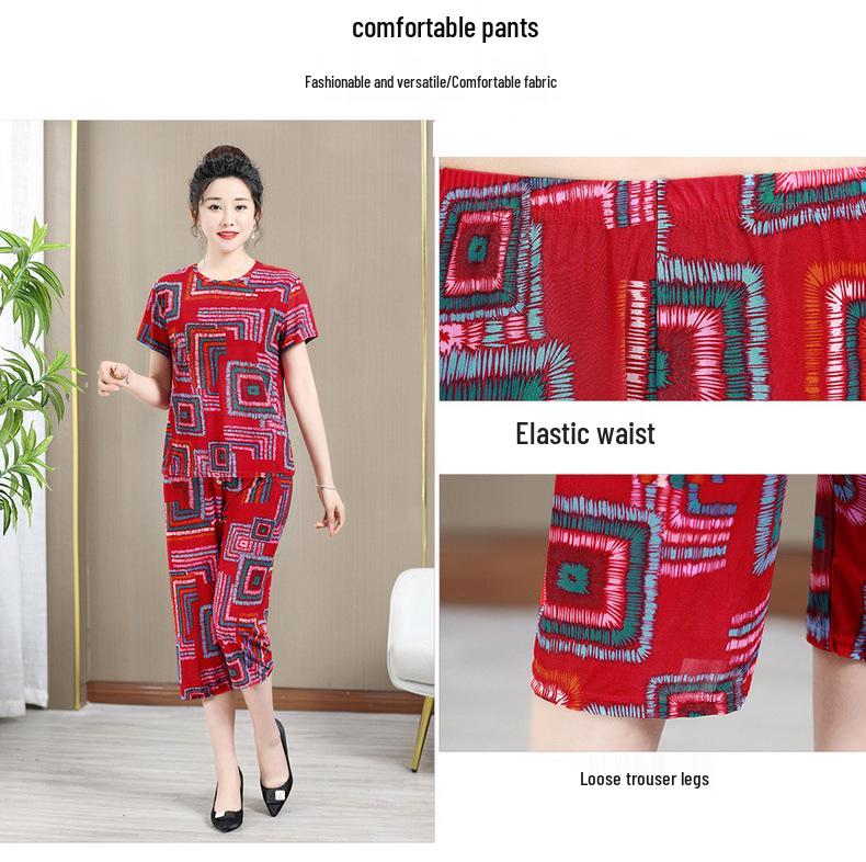 Летний комплект из ледяного шелка для женщин среднего и пожилого возраста - Повседневная домашняя пижама с коротким рукавом