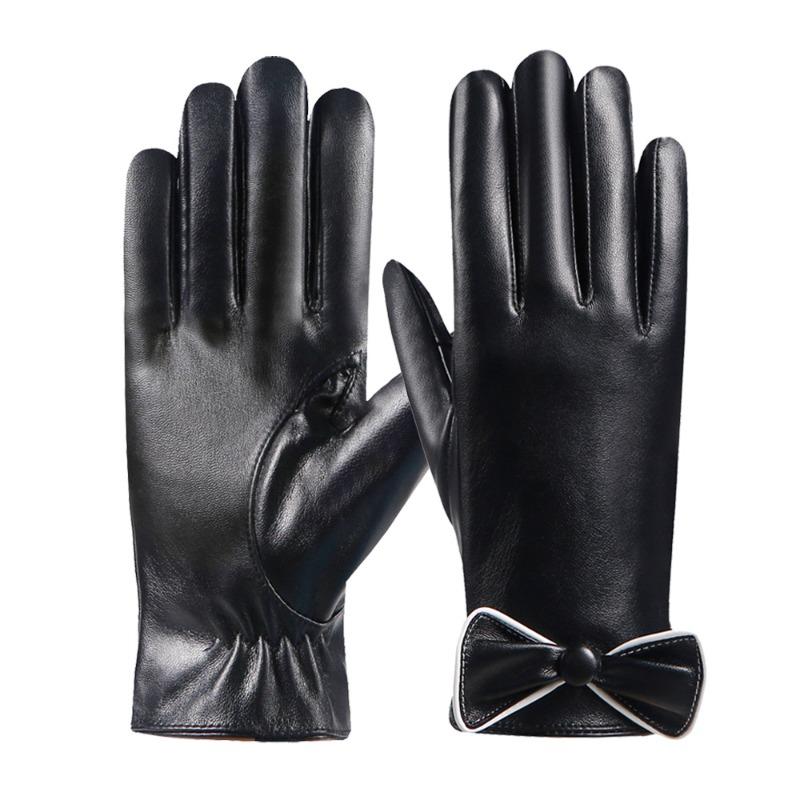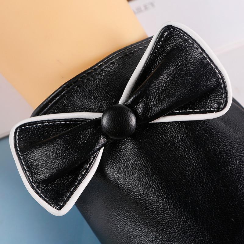 Зимние теплые перчатки женские с бантом бархатные утолщенные из промытой кожи сенсорные анти-холод водонепроницаемые кожаные перчатки