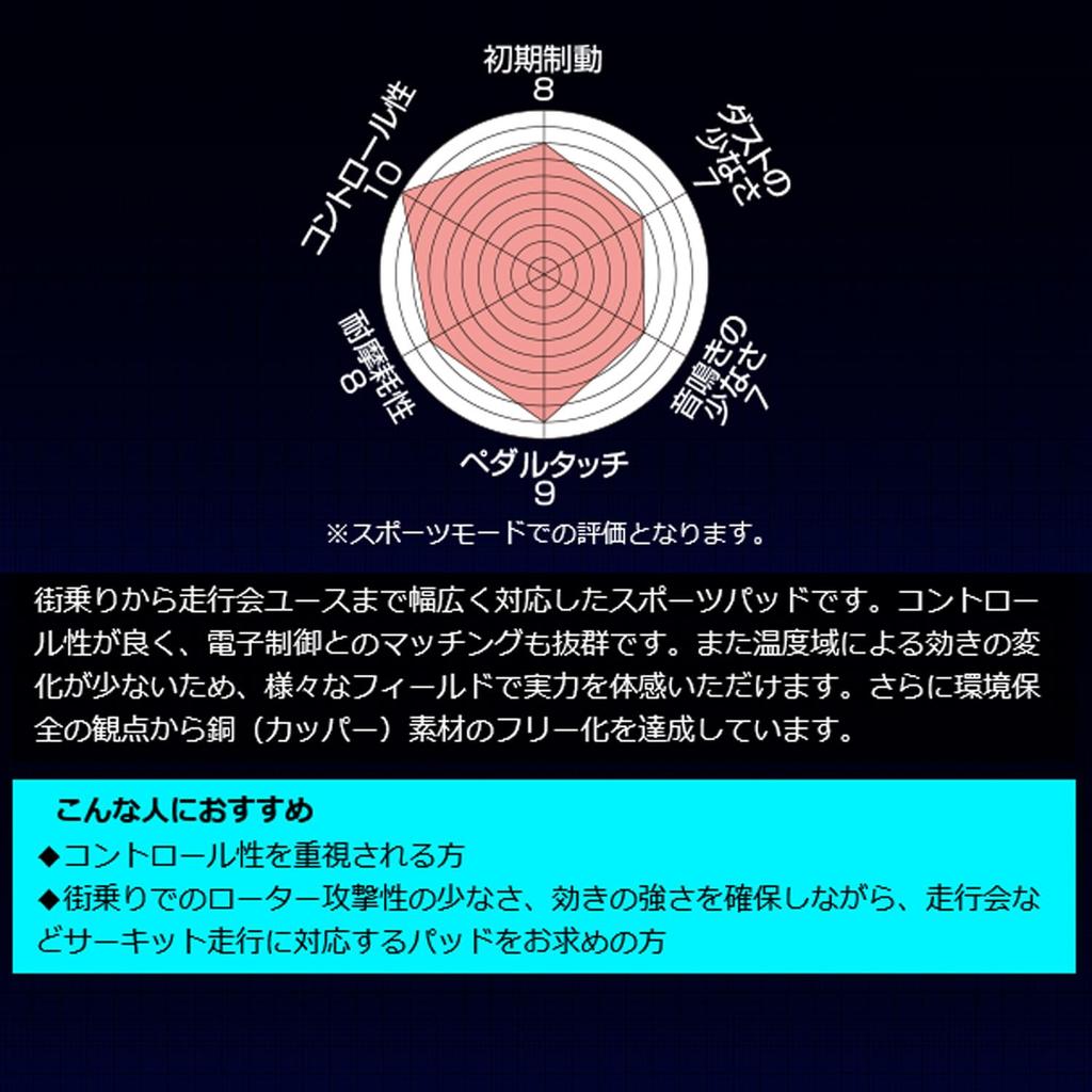 ◆ Для тех, кто ищет колодки, подходящие для трек-дней и других заездов по трассе, сохраняющие при этом низкую агрессивность к ротору и высокую эффективность для вождения в городе.