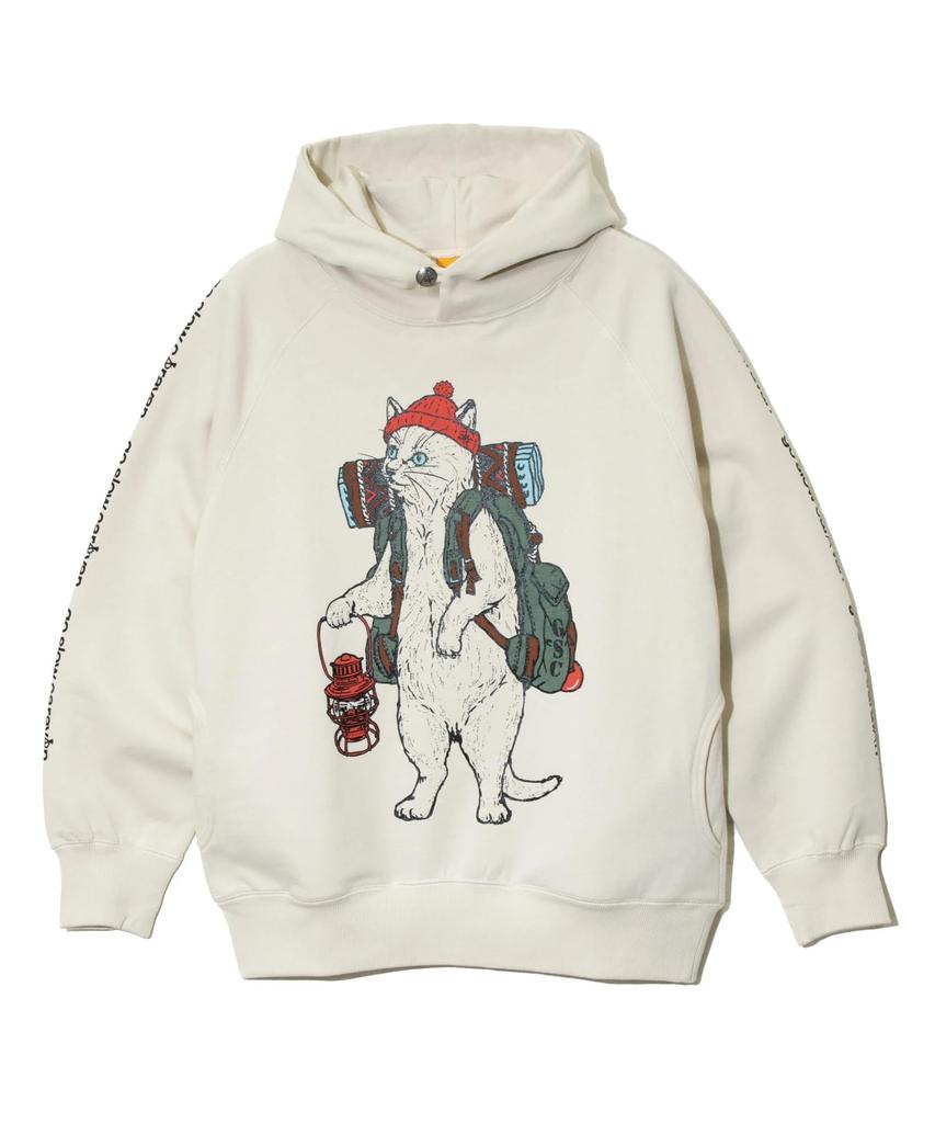 [go slow caravan] 332608 Air-Spun Fleece Pullover Hoodie with a "Camping Cat" Design, Ivory, Size L