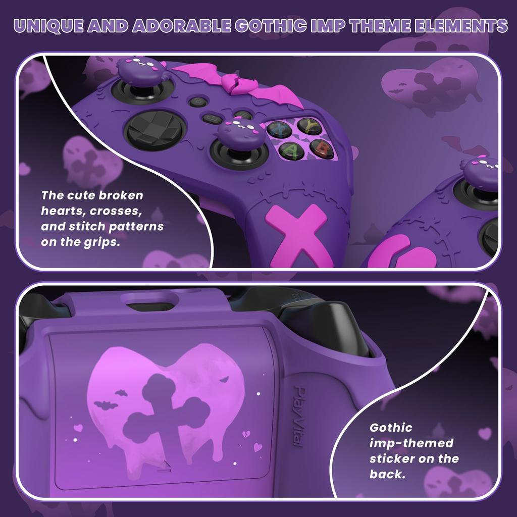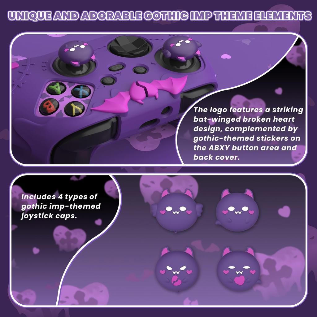 Gothic Charm Design: Broken hearts, crosses, and stitching details on the grips give the controller a unique, spooky, and cute look. The gothic imp stick caps and broken heart logo with bat wings also perfectly match the theme. A back sticker adds to the gothic feel.