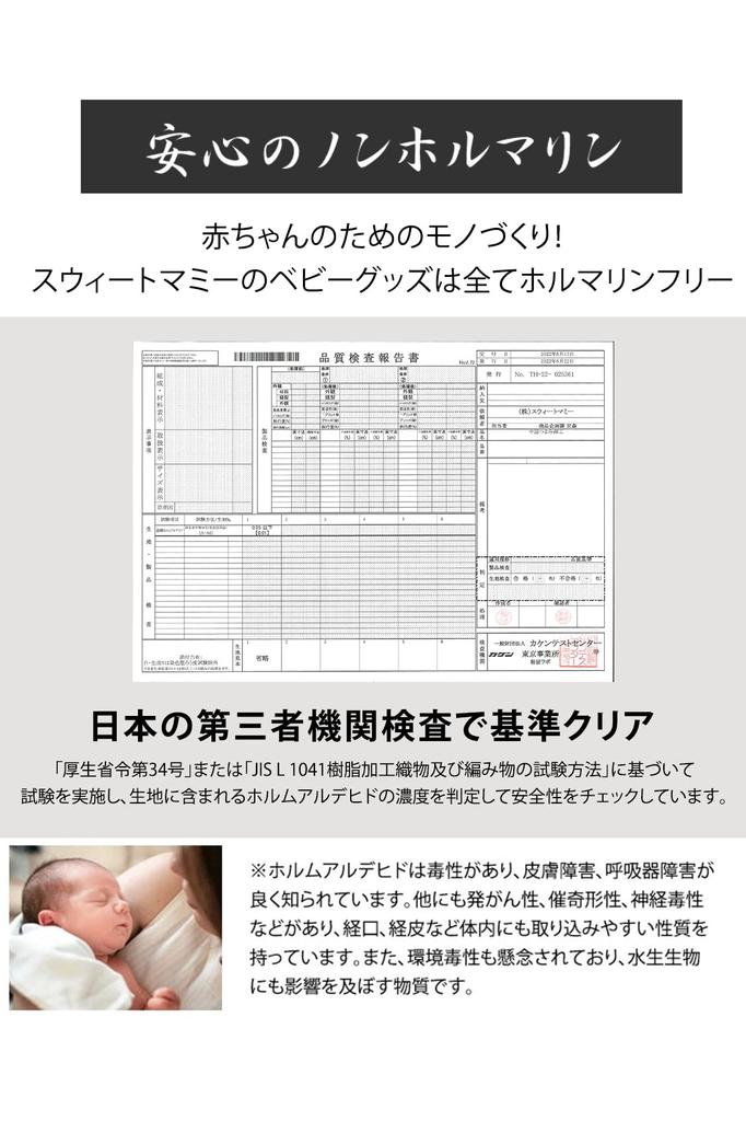 [Без формальдегида] Как компания, создающая товары для младенцев, вся продукция Sweet Mommy не содержит формальдегида. Мы производим и продаем продукцию, прошедшую сторонние проверки в Японии.
