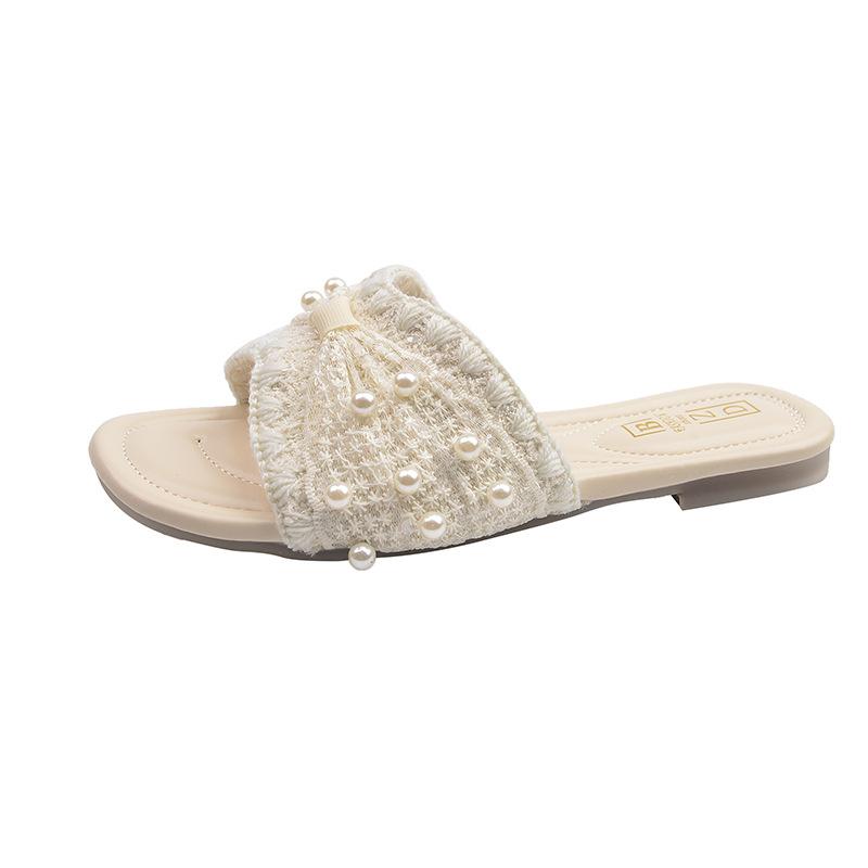 Французские маленькие ароматные тапочки с жемчугом женские летние 2025 новая мода и досуг однословные на плоской подошве пляжные крутые тапочки