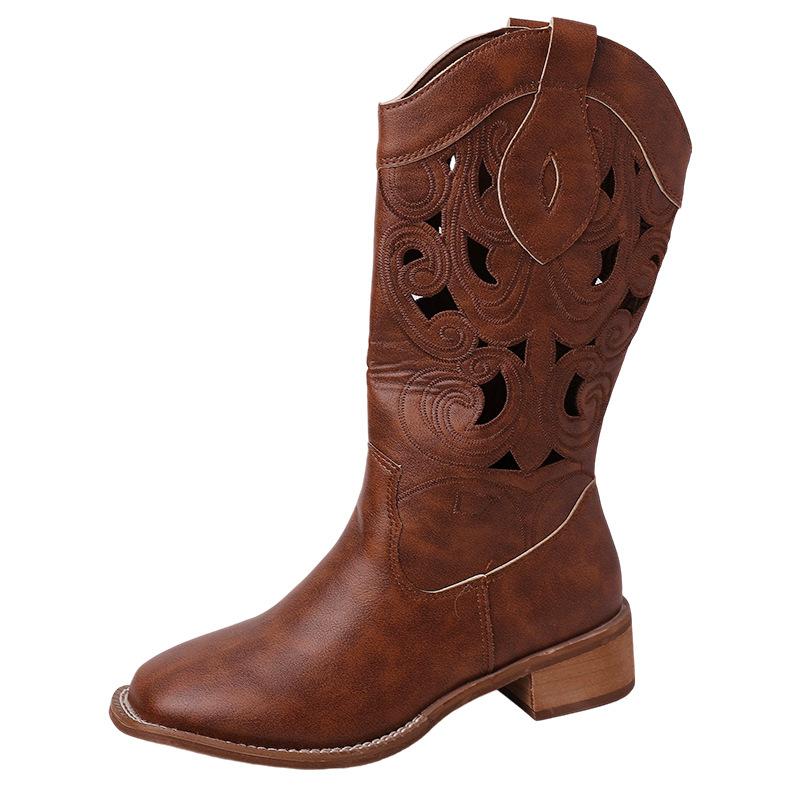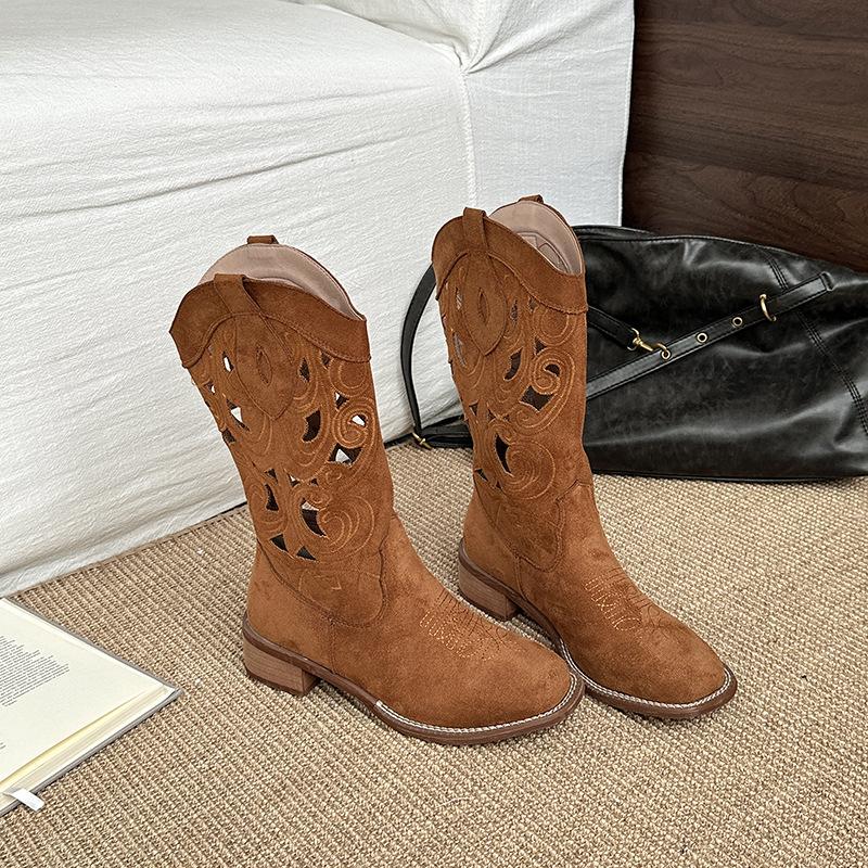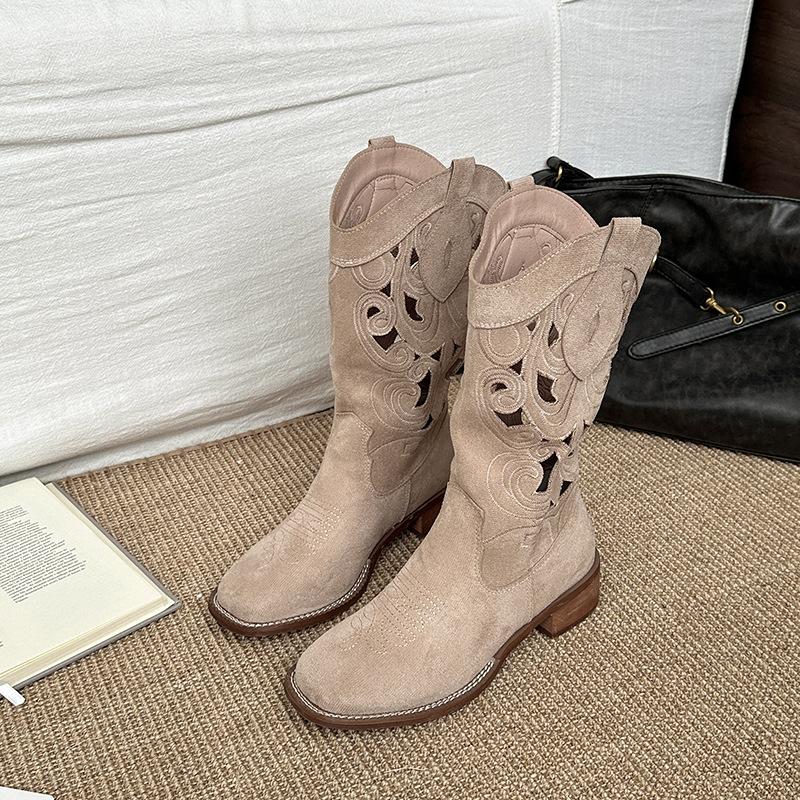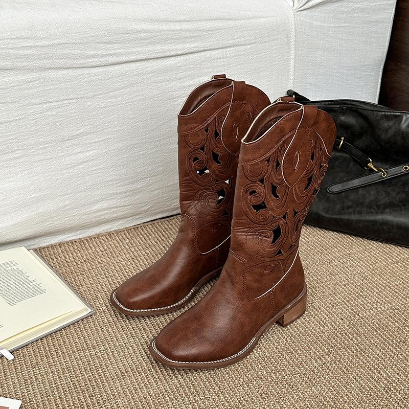 Модные ретро полые вышитые ковбойские сапоги в западном стиле женские 2025 лето новая универсальная верхняя одежда толстый каблук рыцарские сапоги