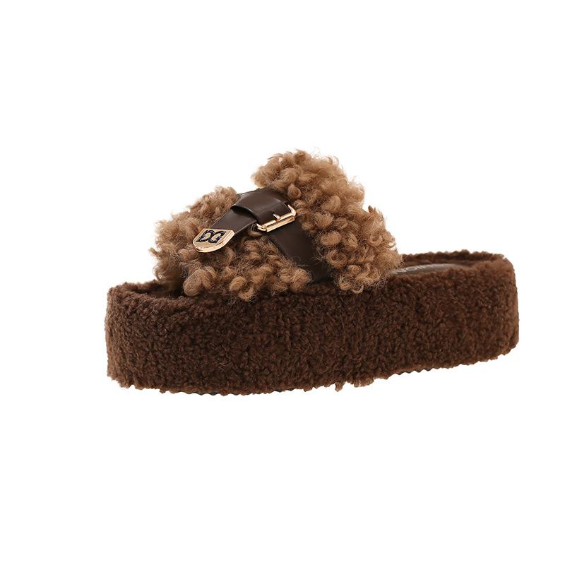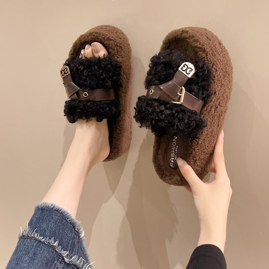 Шлепанцы на толстой подошве с пряжкой, женские, новые, осень-зима 2025, Xiaoxiangfeng из овечьего кудрявого меха, для улицы, плюшевые шлепанцы