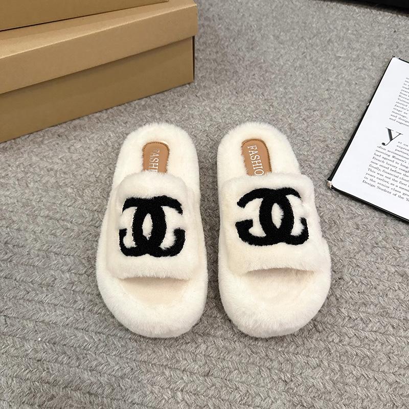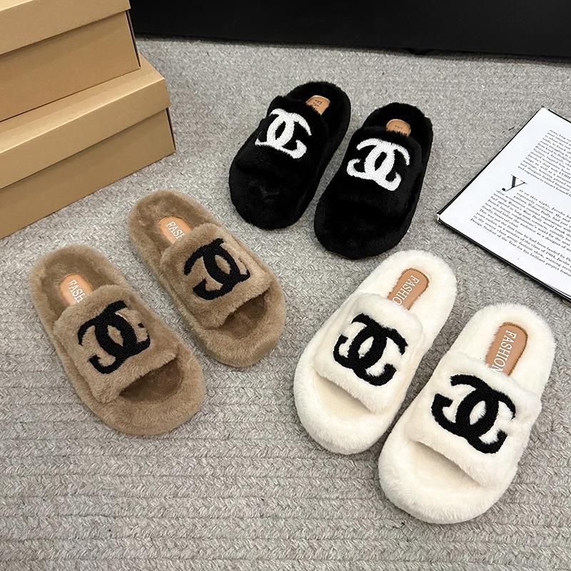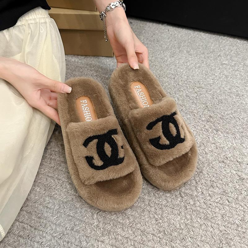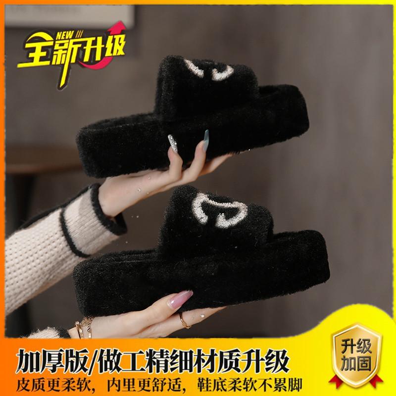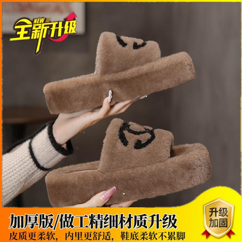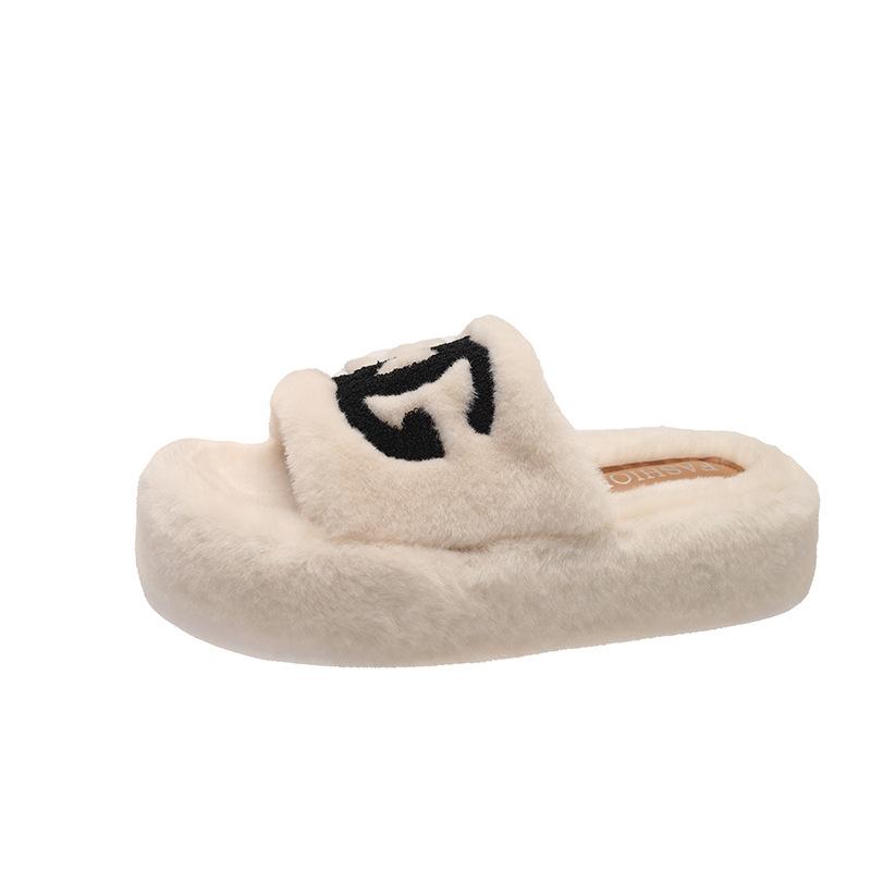 Сяосянфэн пушистые тапочки женские для улицы 2025 осень и зима новые на толстой подошве корейская версия модные с буквенным принтом трендовые хлопковые тапочки