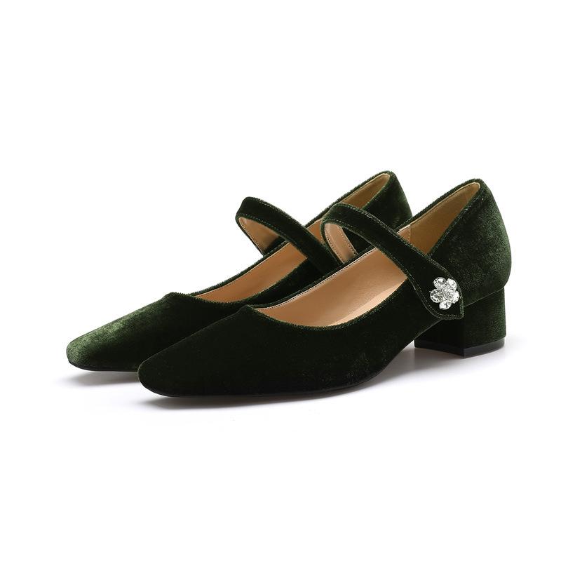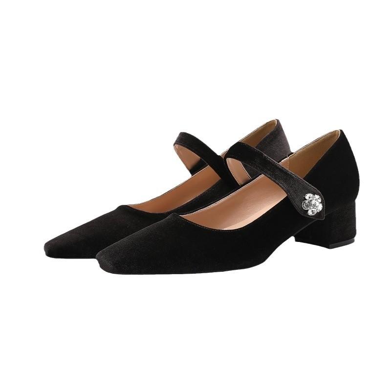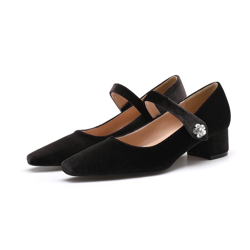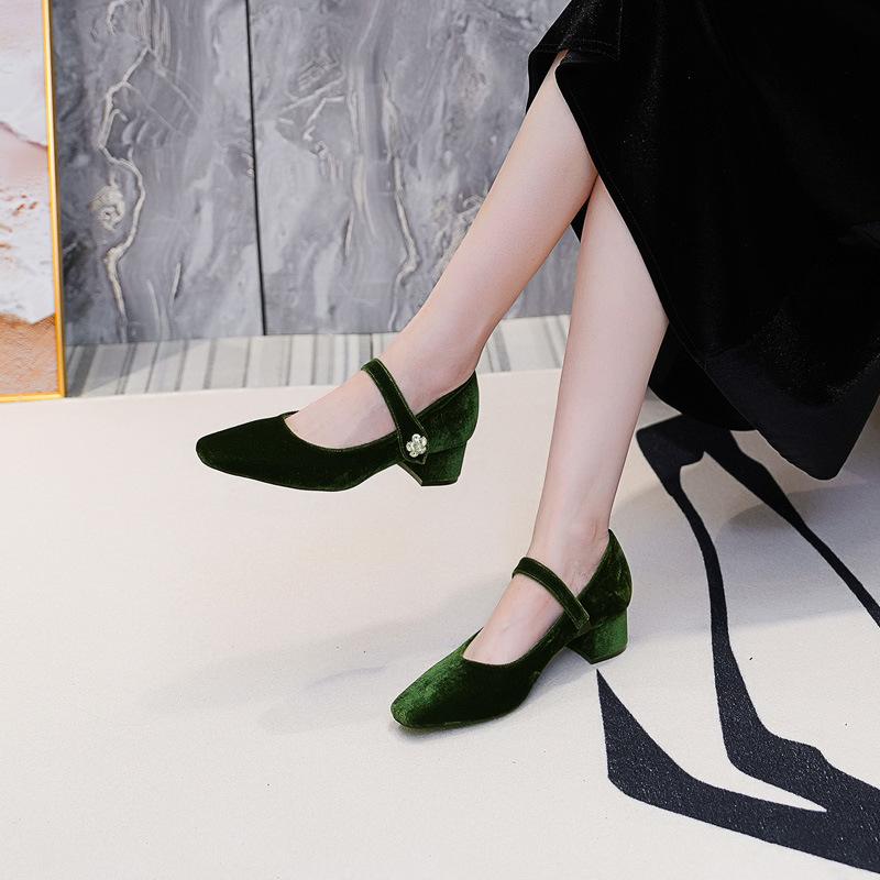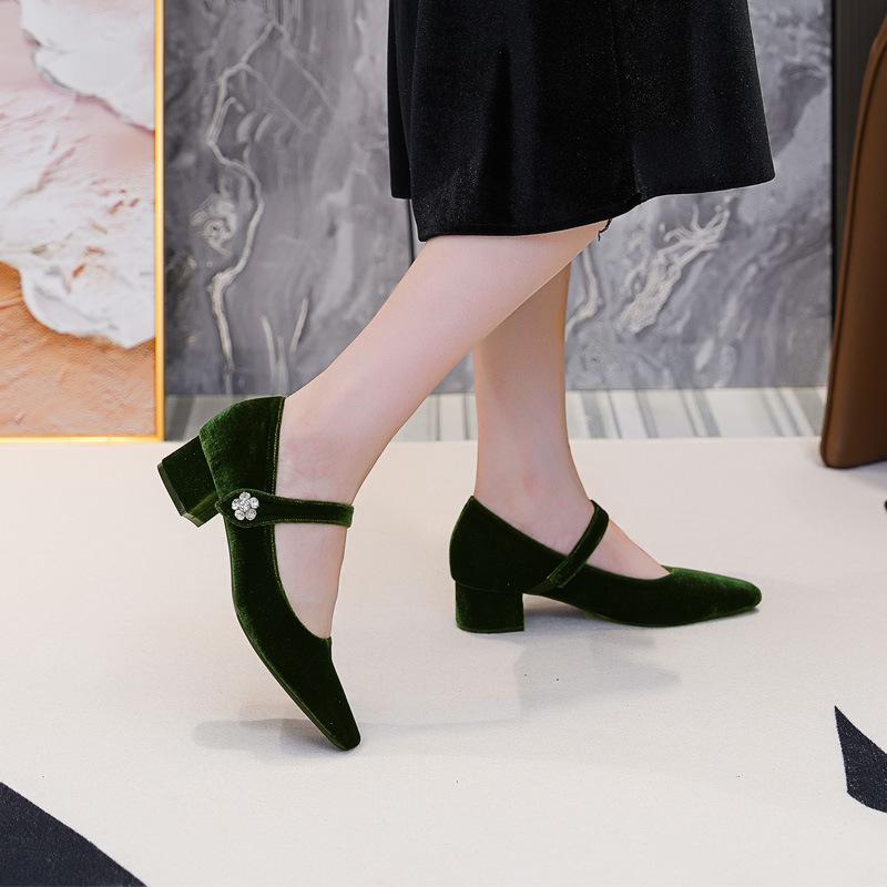 2025 Весна и Осень Мэри Джейн Грубый Каблук Однотонные Туфли Женские Мелкий Вырез Ремешок с Пряжкой Велькро Золотой Вельвет Ретро Женская Обувь Большой Раз