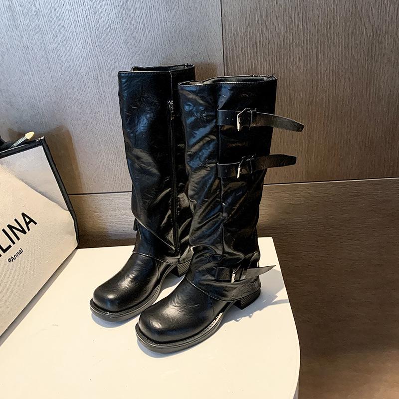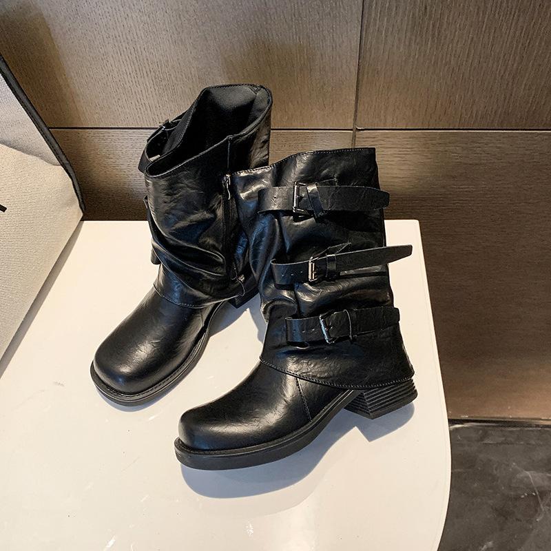 Ботильоны средней высоты на толстой подошве и толстом каблуке с ремешком и плиссировкой, женские, новинка осени 2025, брючные ботинки Мартин, ботинки в стиле вестерн, короткие ковбойские ботинки