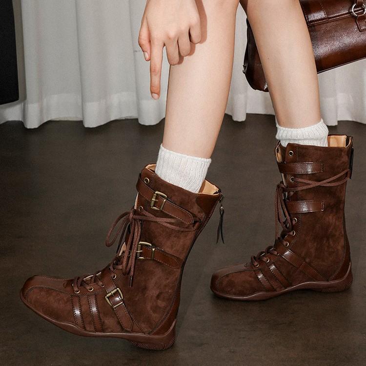 Издание из коровьей кожи~ Ретро Сплайсинг Замша Боксерские Ботинки Женская Мода Ниша Пряжка на Ремне Шнуровка Задняя Молния Ботинки Мартин