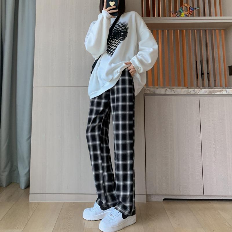 Повседневные клетчатые брюки женские новые осенние свободные прямые с высокой посадкой драпирующиеся модные универсальные и тонкие брюки-палаццо женские