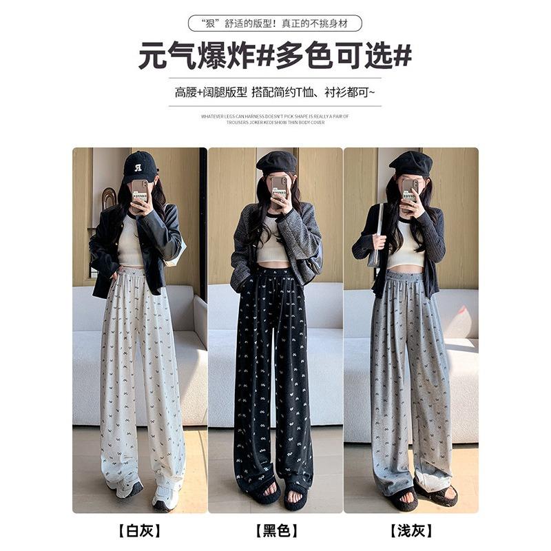 Серые спортивные штаны с бантом женские весенне-осенние новые с высокой посадкой прямые ленивый ветер маленькая драпировка широкие брюки