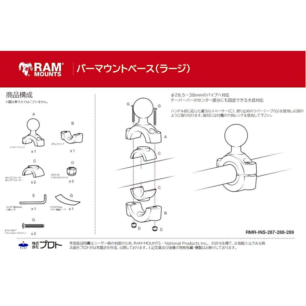 RAM MOUNTS Bar Mount Fits Diameters Black Base, 28.5-38.1mm,