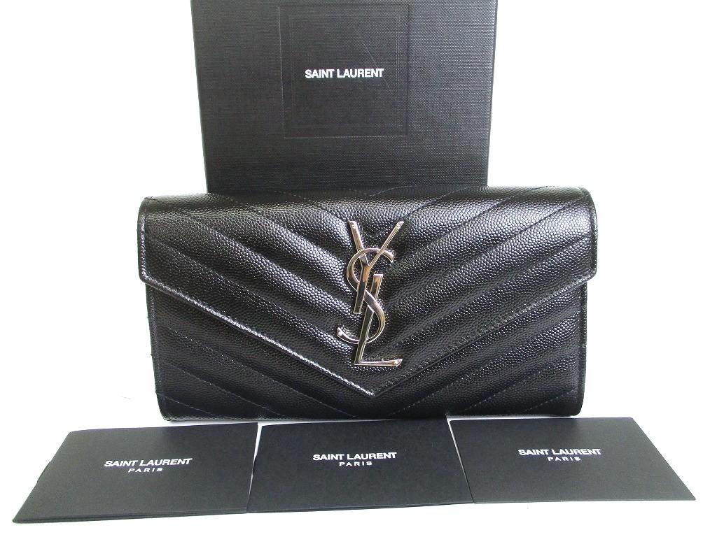 Оригинальный кошелек Saint Laurent YSL серебристый мотив YSL черная кожа длинный кошелек с клапаном #a875 Восстановленный