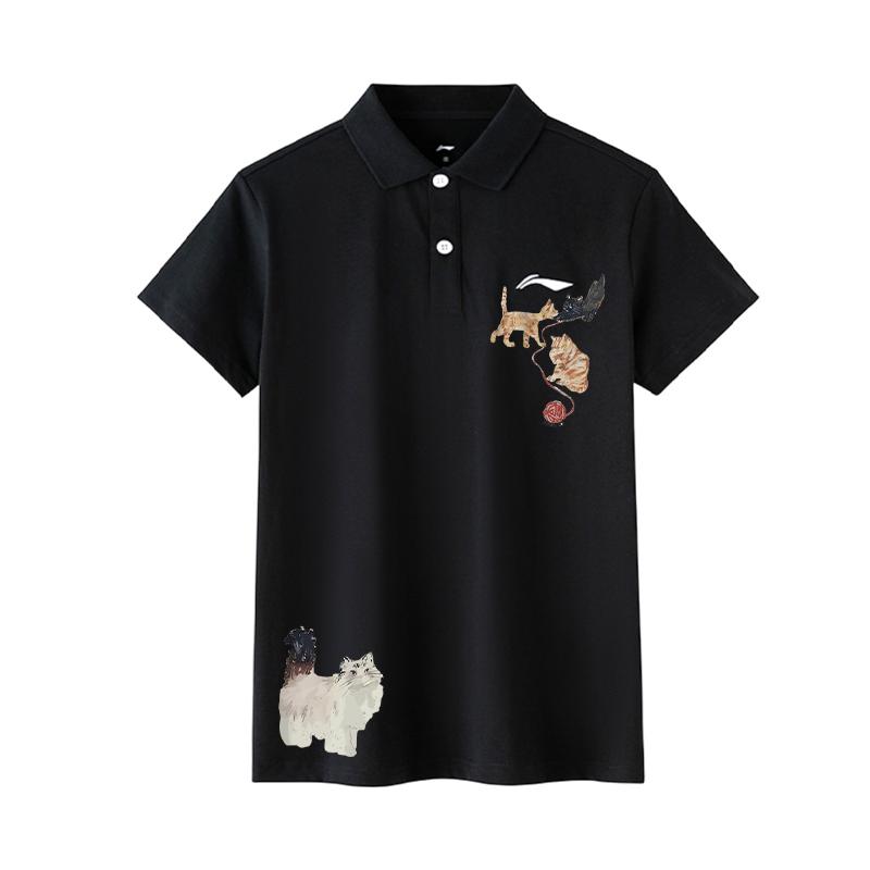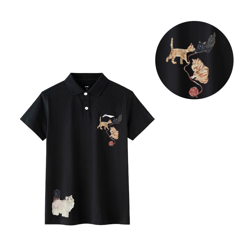 Li Ning Универсальная трикотажная футболка-поло с принтом логотипа кошки в стиле хай-стрит, удобная для улицы, свободного кроя, со спущенным плечом, с коротким рукавом APLT137-1(TEAM702-A16)
