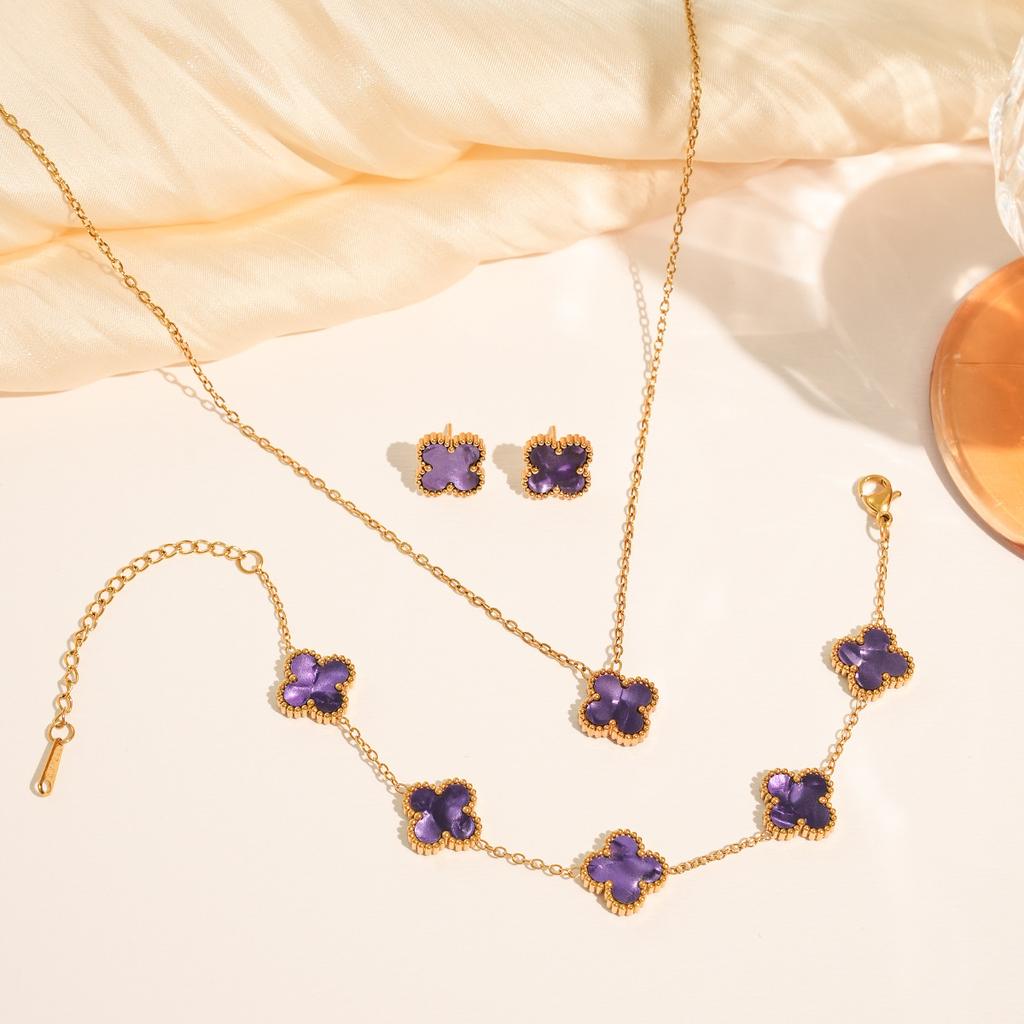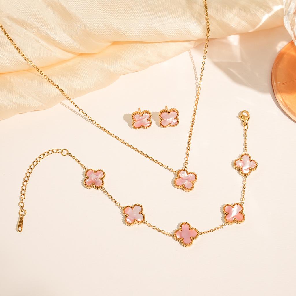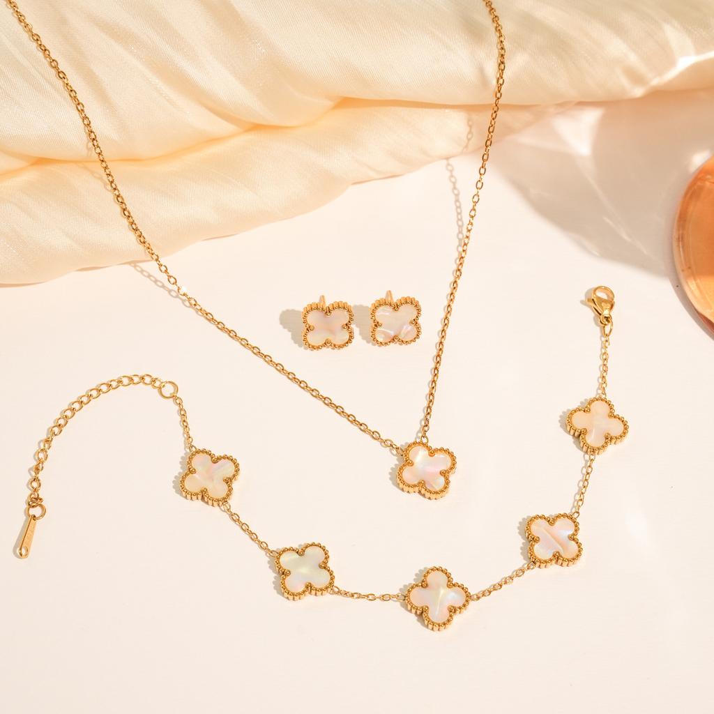 Набор из трех предметов из титановой стали, не выцветающий, двухсторонний, с четырехлистным цветком: ожерелье, браслет, серьги.