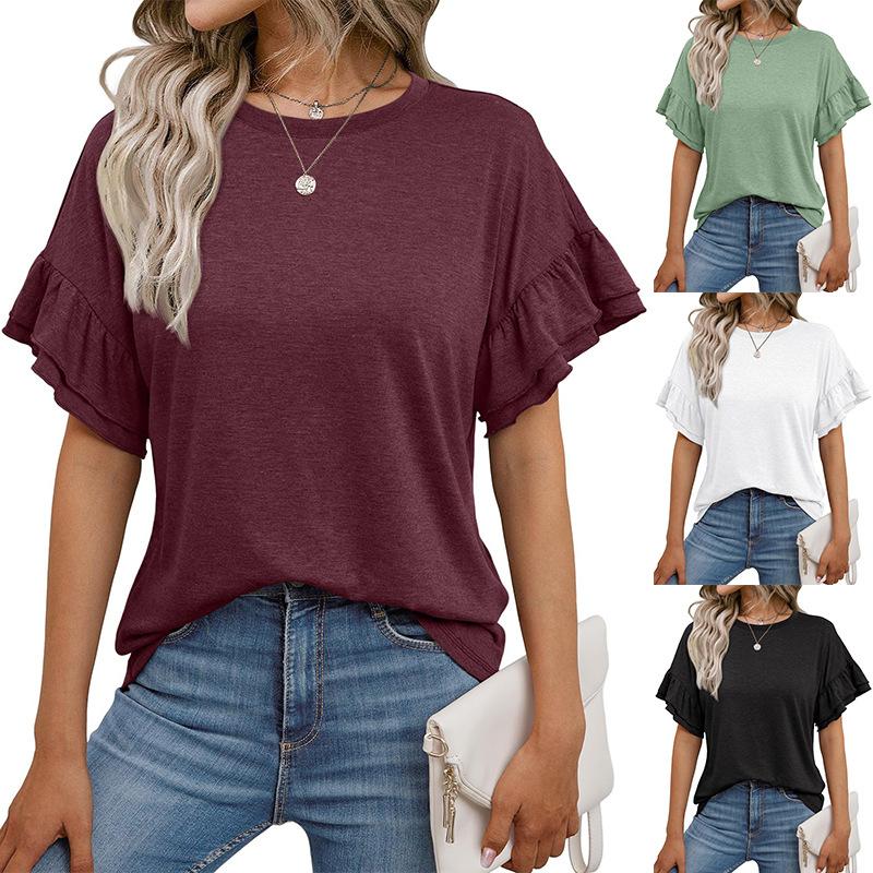 Женская летняя футболка с коротким рукавом-рюшем, с круглым вырезом, однотонная, пуловер, топ