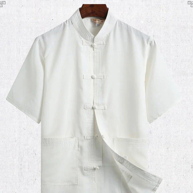 Китайский костюм Тан, костюм с короткими рукавами, мужская рубашка ханьфу, кунг-фу, тай-чи, сплошной цвет, хлопково-льняная одежда, летняя льняная одежда