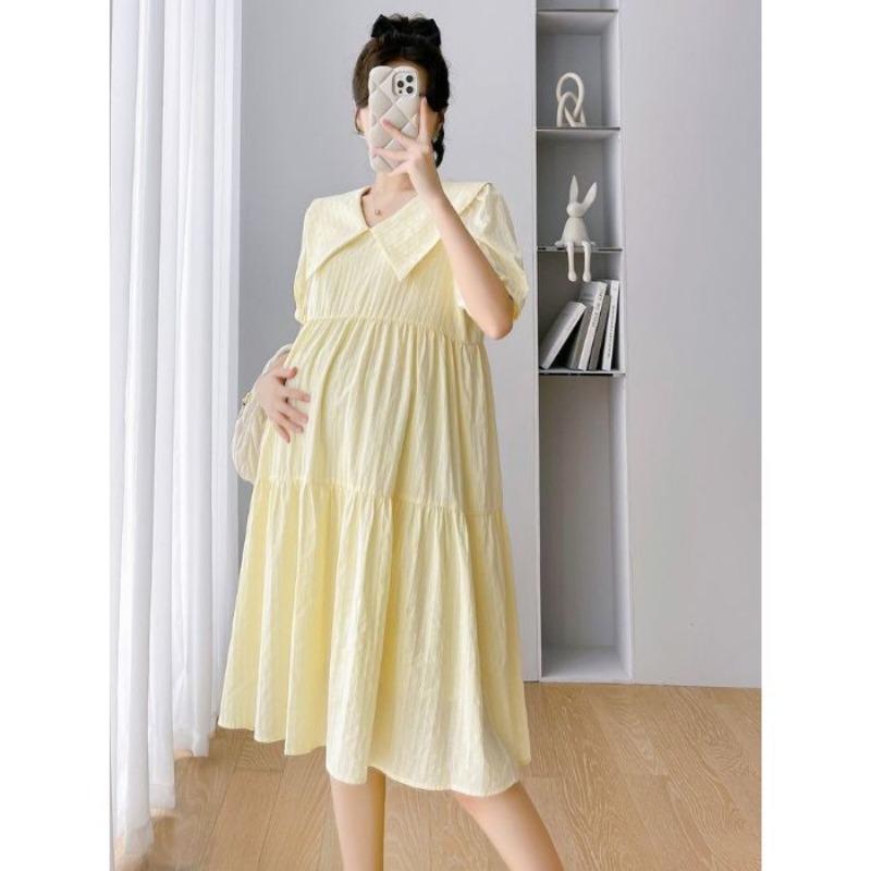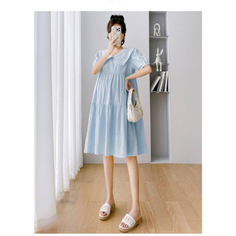 Одежда для беременных маленькое свежее платье с короткими рукавами и кукольным воротником женское летнее милое платье для уменьшения возраста с прикрытием живота свободное темпераментное платье для беременных