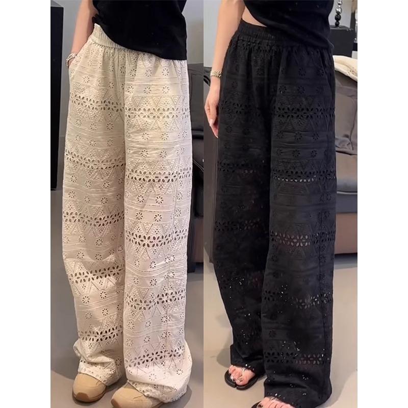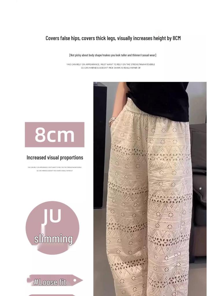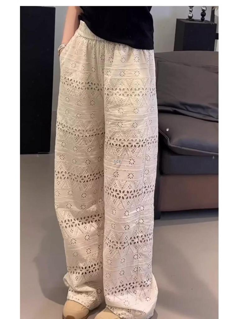 Лето 2025 Женские кружевные ажурные брюки-палаццо с высокой талией и драпировкой - Ледяной шелк Прохладные и повседневные Маленький размер