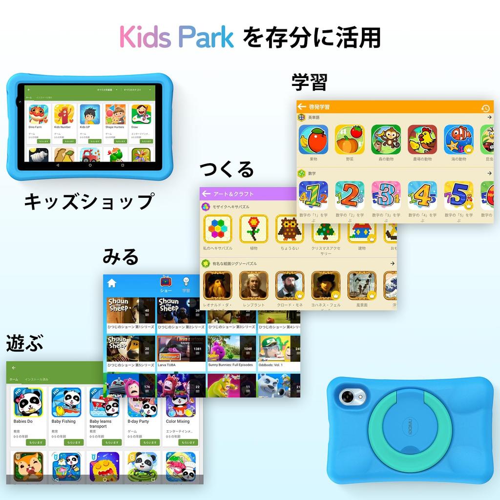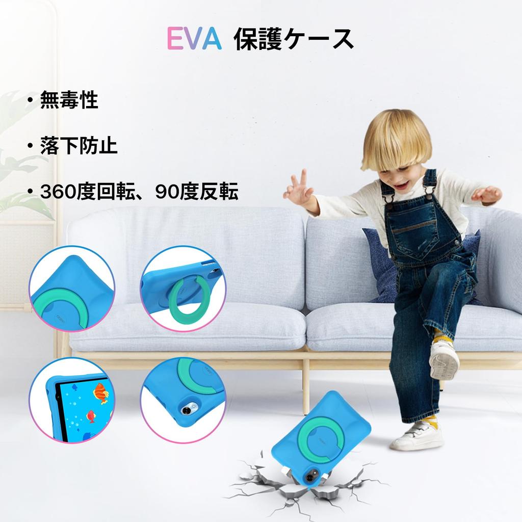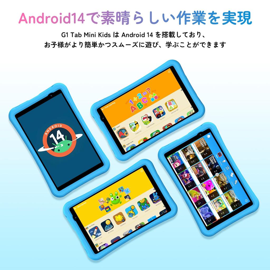 [8-inch IPS Touchscreen & Pepkoo-Certified Protective EVA Reinforced Case] This 8-inch WiFi model is equipped with the Android 14 system and features an IPS touchscreen, providing a wider field of view and vivid color display, making images clearer and more vivid. The 8-inch tablet is easy to carry with one hand, making it suitable for children to use. Additionally, the G1 Tab mini Kids comes with a patented, shock-resistant protective case made of child-friendly, non-toxic, shock-absorbing EVA soft foam. Its unique design protects the corners from damage when the tablet is dropped.