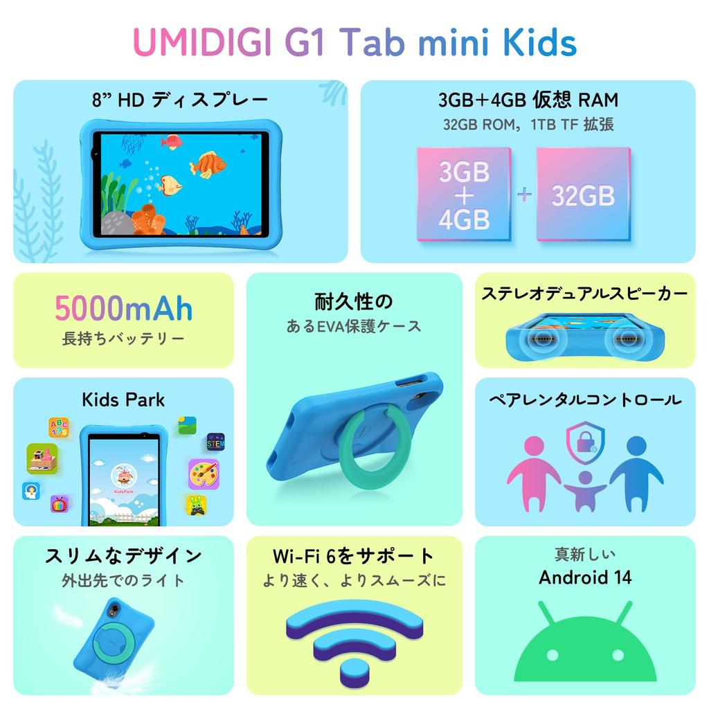 [First-of-its-kind Android 14 kids' tablet with 2.4G/5G WiFi 6] The UMIDIGI G1 Tab mini Kids features the new Android 14 system, significantly improving platform performance and efficiency, and enhancing app compatibility. It also speeds up app launches, conserves power, and extends tablet usage time. Compared to Android 13, Android 14 places a greater emphasis on protecting user privacy, allowing users to choose whether to allow apps to access specific photos, videos, and more. Supporting 2.4G/5G dual-band WiFi 6, the G1 Tab mini Kids tablet offers faster speeds, more stable connections, superior performance, and wider coverage, providing users with a better wireless network experience while working, learning, and playing.