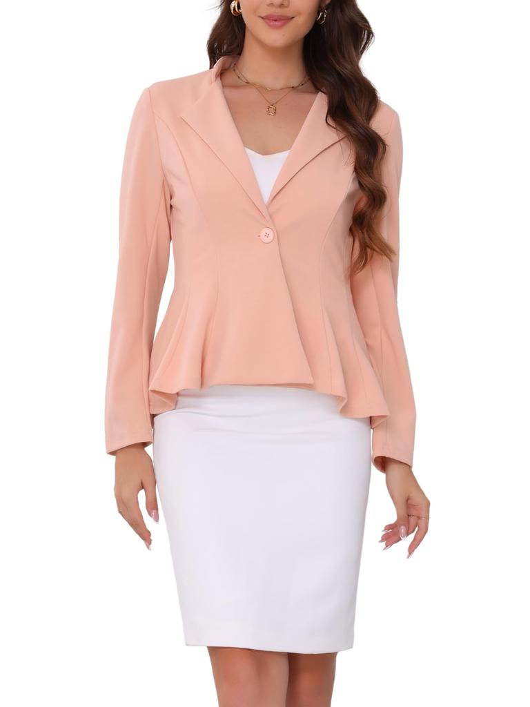 Этот элегантный блейзер имеет воротник-стойку, длинные рукава, застежку на одну пуговицу и лестный силуэт пеплум — идеально подходит для создания изысканного образа на работе.